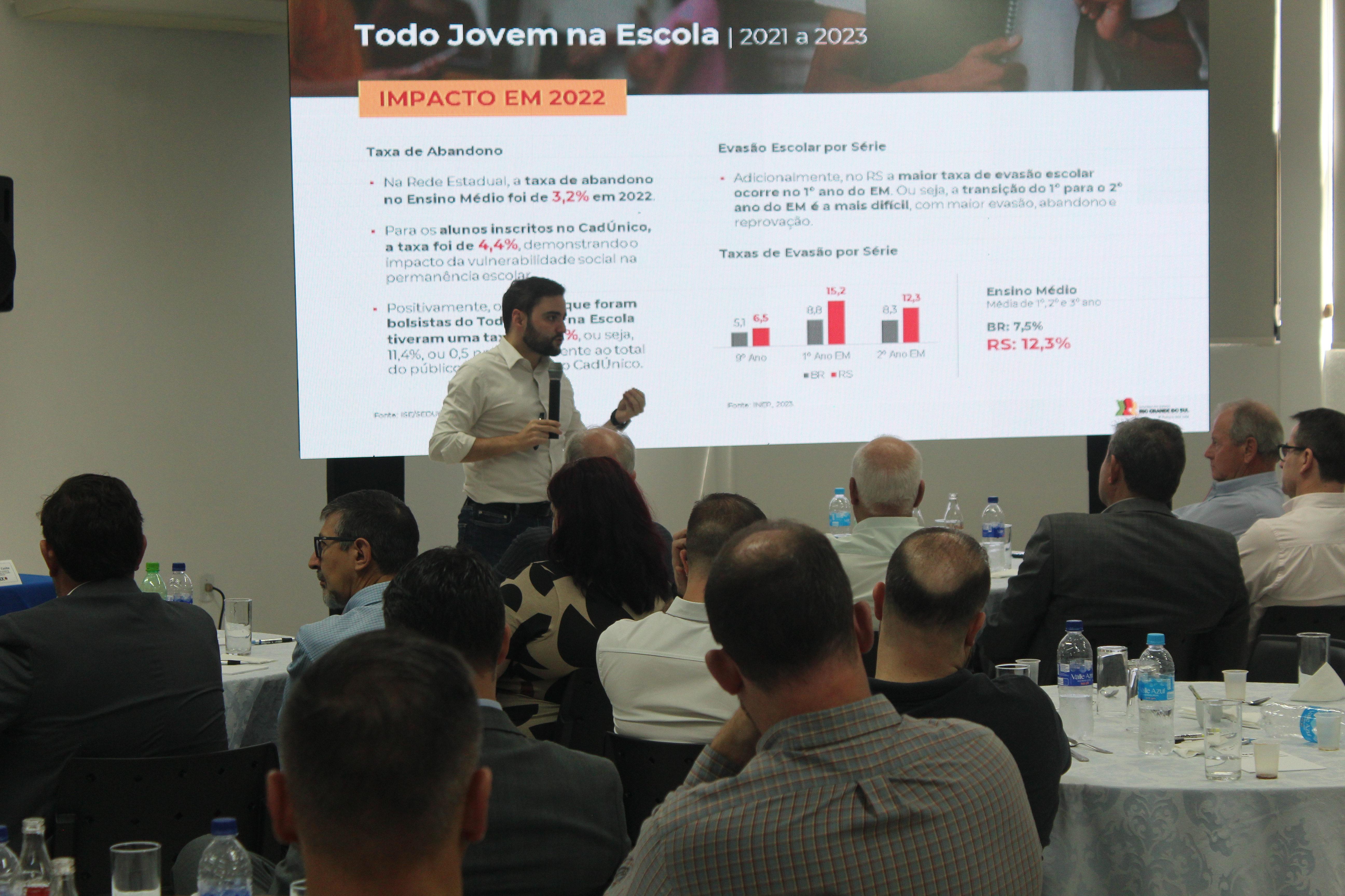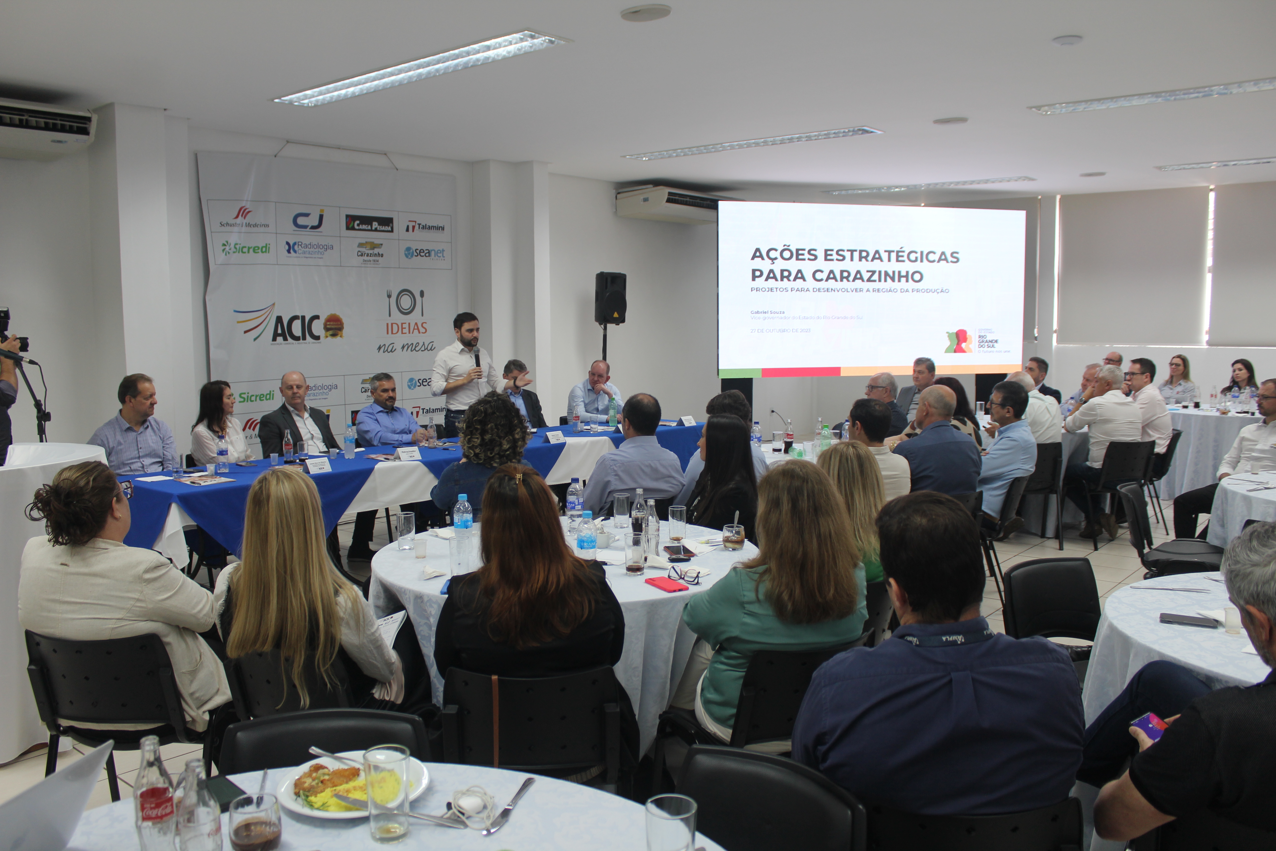 Depois do almoço, Gabriel Suza fez palestra em que abordou várias assuntos, entre eles o endividamento do Estado, as interpéries climáticas que vem assolando o Rio Grande do Sul e causando mortes e prejuízos em 2023. Também abordou investimentos projetados para o mandato que iniciou em janeiro, inclusive relacionados a Carazinho. Entre eles está a participação do município em programas de melhoria da qualidade de vida na primeira infância. Na área da educação, citou investimentos em escolas como a de Ensino Médio Paulo Frontin, que recebeu repasse de R$ 24,8 mil para reparos na cobertura da quadra de esportes.