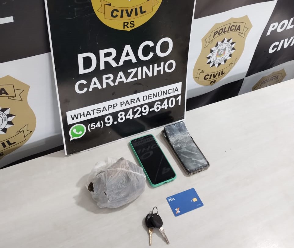Durante investigação da DRACO, foi descoberto um local onde era realizada a distribuição de entorpecentes para traficantes do município de Carazinho, motivo pelo qual, nesta data, ao realizarem diligências para o cumprimento de um mandado de busca e apreensão na residência, foi avistado dois indivíduos em um veículo recebendo dois invólucros de droga. O veículo foi acompanhado e os ocupantes foram abordados, sendo que neste instante tentaram jogar os pacotes de droga fora. Apesar da tentativa, as drogas foram encontradas e os indivíduos foram presos.