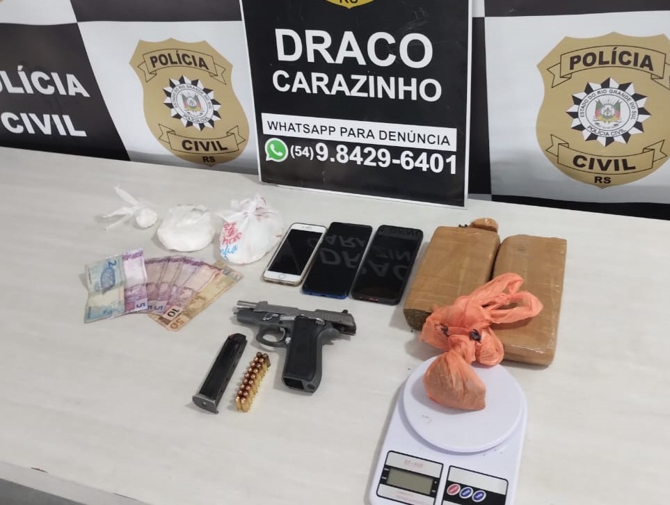 Na tarde desta terça-feira (30), a DRACO de Carazinho realizou a prisão de 4 pessoas em flagrante pelo crime de tráfico de drogas e posse irregular de arma de fogo.