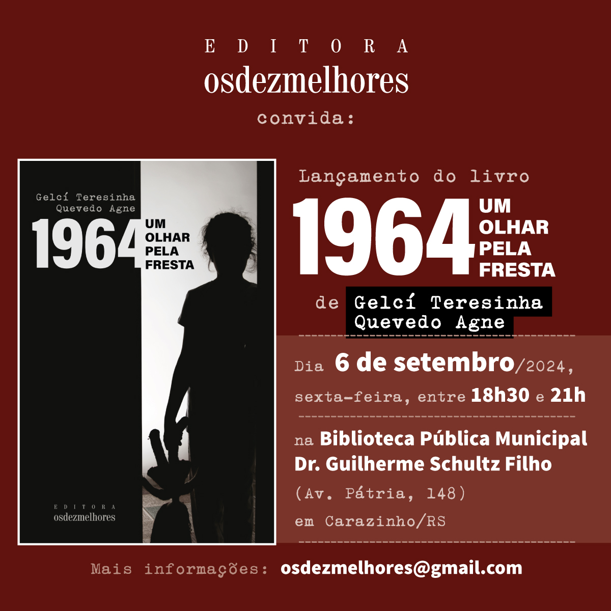 Gelcí, apenas uma criança, se escondeu embaixo da cama e, pela fresta, assistiu sua família e a vida que conhecia ruir. E agora, no ano em que o Golpe Militar completa 60 anos, Gelcí finalmente saiu de seu esconderijo para encarar a sua história não mais pela fresta, mas de frente. O resultado é a obra 1964: um olhar pela fresta, onde a autora conta a sua própria história entremeada com a história de Carazinho, apresentando aos carazinhenses um registro contundente e honesto sobre um dos períodos mais escuros e tristes do Brasil.