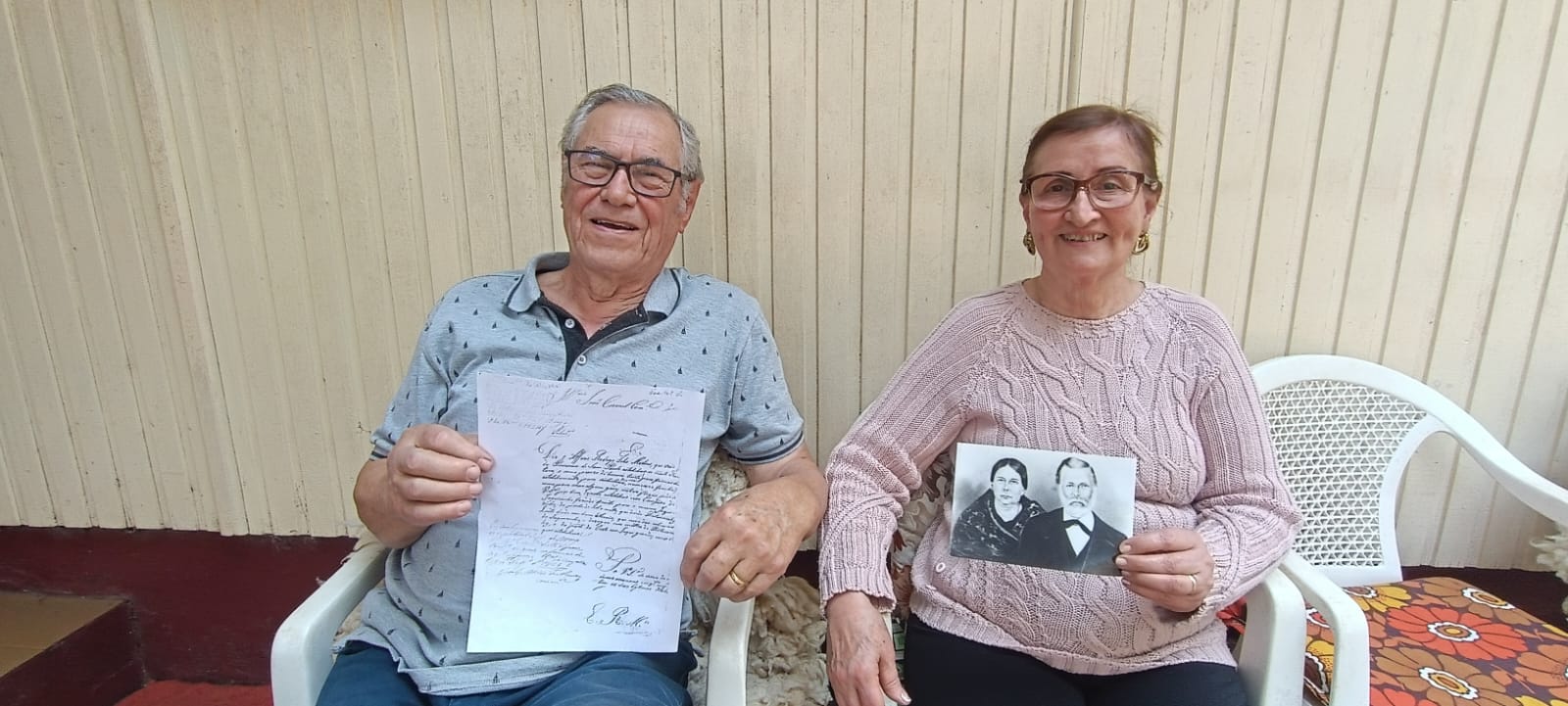 Professores José e Maria Sperry com a cópia da escritura e a foto da filha do povoador Alferes Rodrigo Félix Martins (Foto Mara Steffens/O Correspondente)