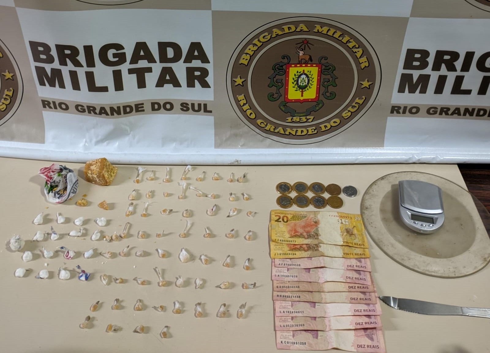 Durante incursão a pé pela rua citada a equipe abordou um indivíduo, e ao realizar buscas pessoais localizou na mochila do adolescente, 60 pedras de crack já fracionada para a comercialização, 01 pedra grande de crack pesando 40 gramas, 16 porções de cocaína, uma balança de precisão, um prato e uma faca, usados no fracionamento do entorpecente.