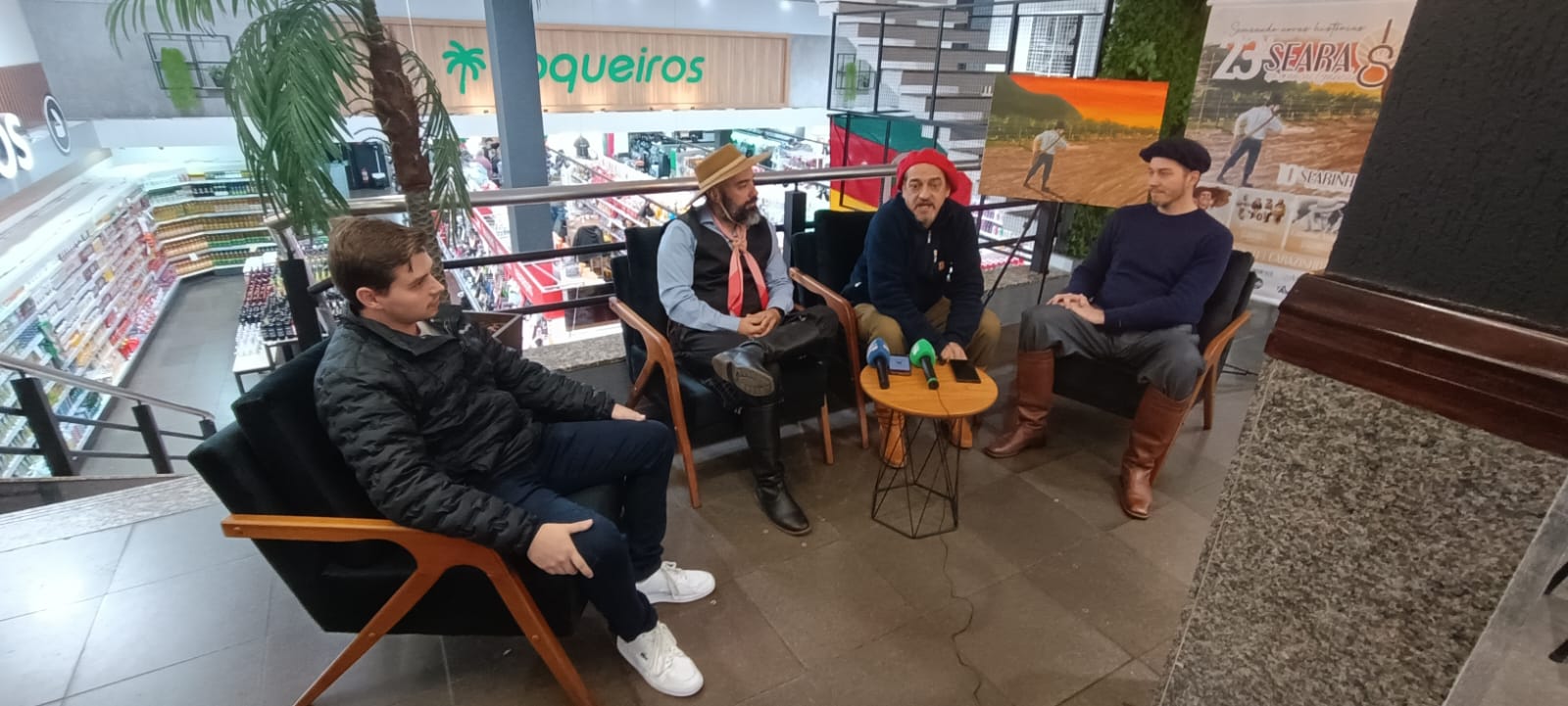 No início da tarde desta quinta-feira (5), no Supermercados Coqueiros centro, o músico Jairo Lambari Fernandes falou em entrevista coletiva sobre a triagem das mais de 700 músicas inscritas na 23ª Seara da Canção Gaúcha. Ele esteve acompanhado do presidente do festival, Marlon Britto, o diretor artístico, Gustavo Weber, e o diretor de projetos do Coqueiros, Enzo Rheinheimer.
