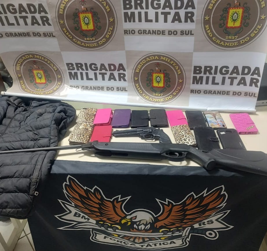 Durante buscas foi encontrado em sua cintura um simulacro de arma de fogo, bem como as roupas utilizadas nos delitos, além de uma espingarda de pressão 5.5mm e diversas capas de celulares, material sem procedência.