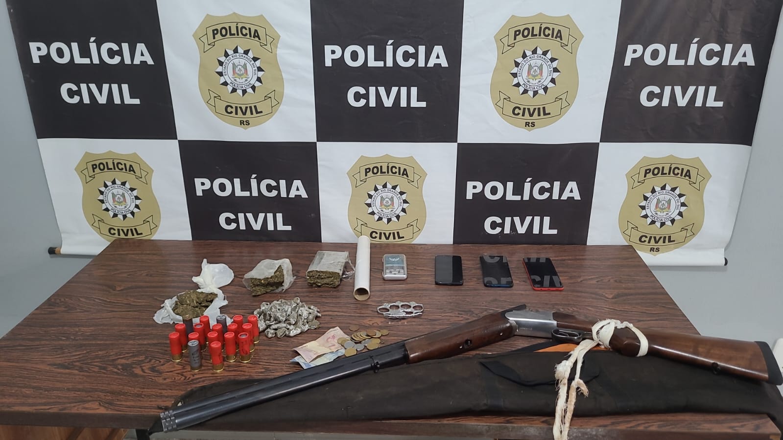 No local foram localizados aproximadamente 700g de maconha, sendo que parte da droga já estava fragmentada em 52 porções e embalada em papel filme, pronta para a venda. Além disso, foi encontrada uma espingarda calibre 12 que estava em situação de roubo, ocorrido na cidade de Espumoso no mês passado. Ainda, foram apreendidas 17 munições calibre 12 intactas, uma balança de precisão e um soco inglês (soqueira).