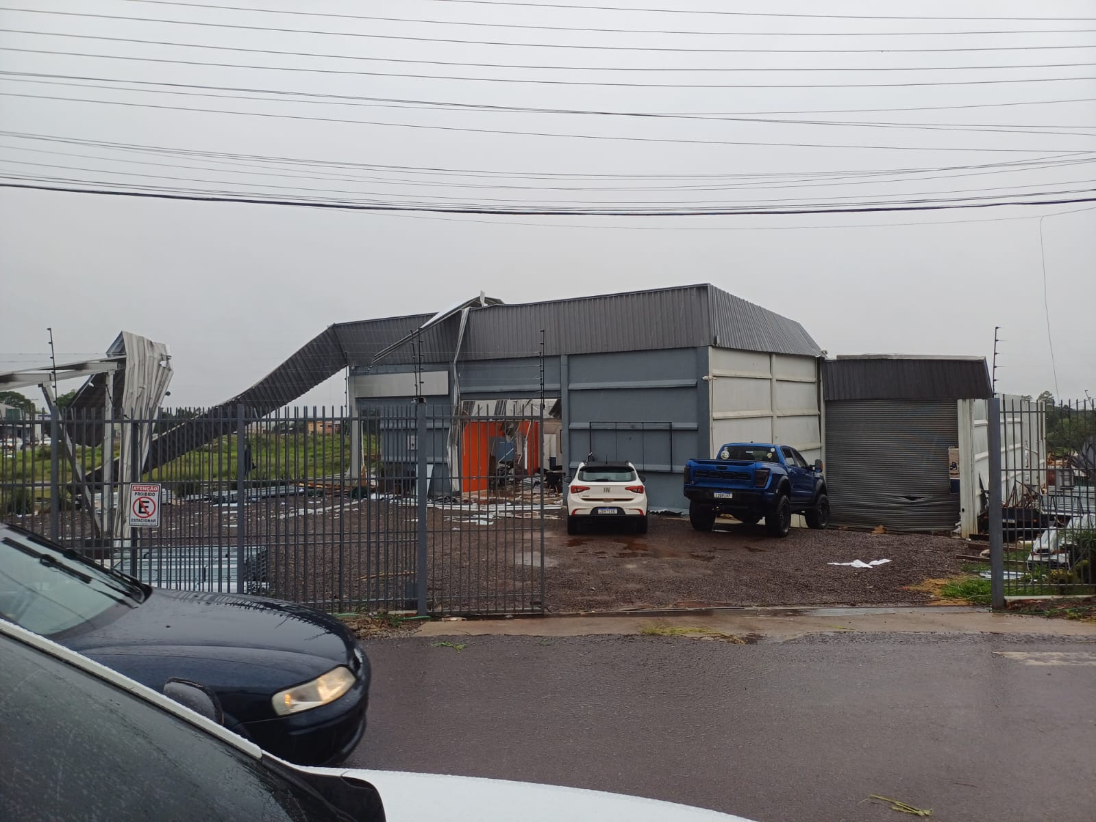 Uma empresa no bairro Bairro Planalto, na saída lada Não-Me-Toque teve o telhado completamente arrancado pelo vento. Também há árvores caídas em vários pontos.