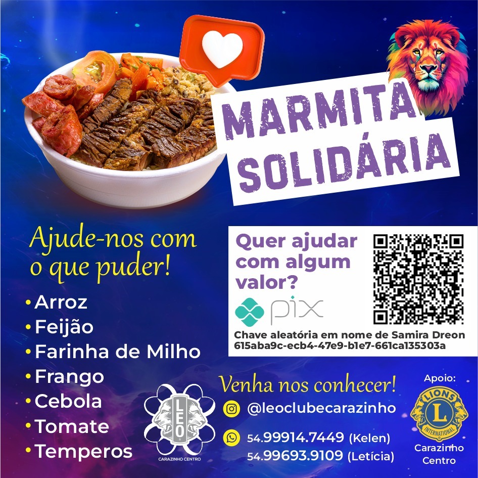 O LEO Clube Carazinho Centro realiza no próximo domingo, 08, mais uma edição da Campanha Marmita Solidária. A iniciativa integra a série de ações de serviço voltadas à comunidade carente do município. O preparo dos alimentos será realizado no CTG Vento Minuano e a distribuição a cargo de parceiros do clube em bairros carentes.