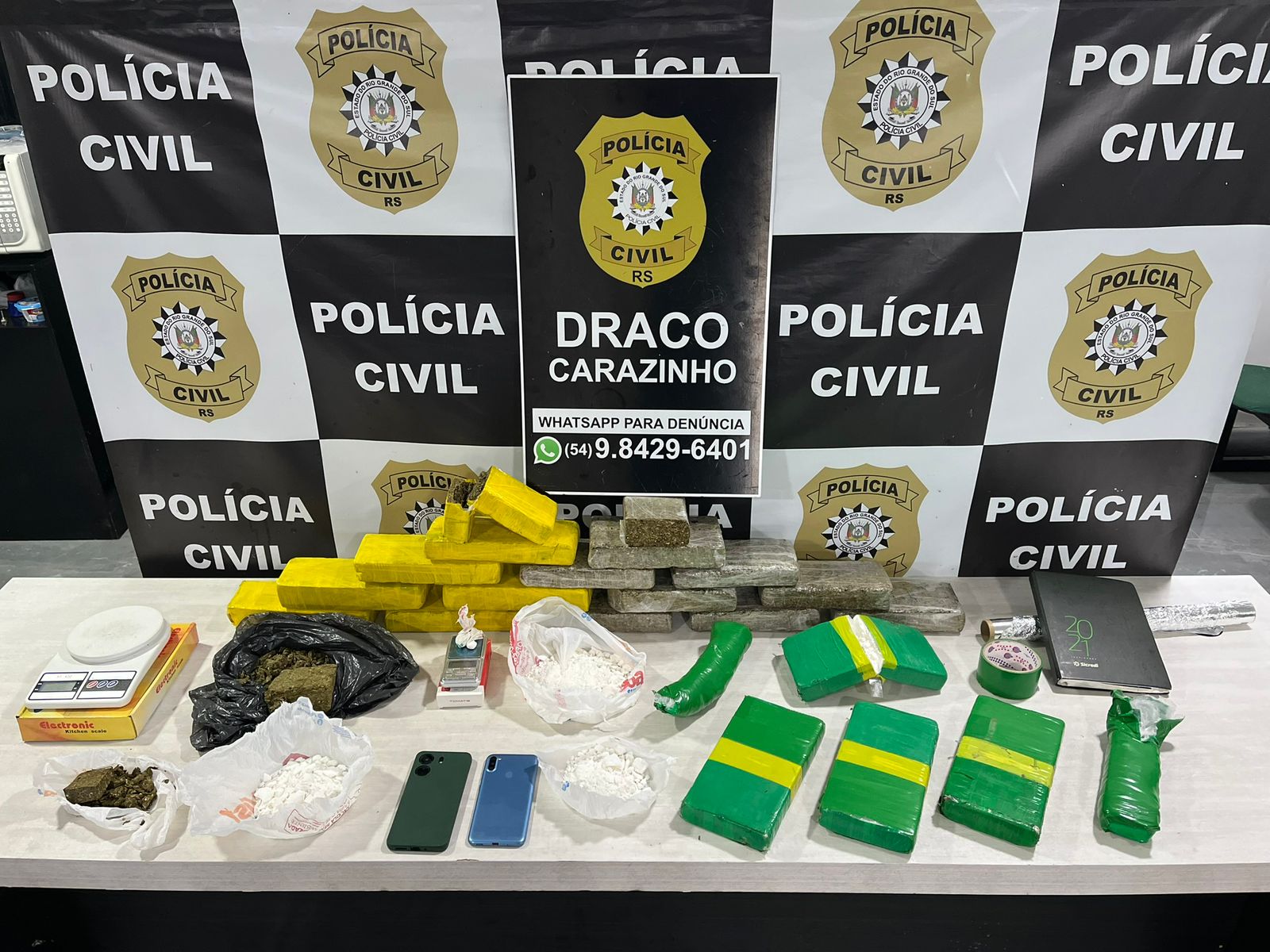 No local, foram encontrados dois indivíduos, um natural de Carazinho e outro do estado de Santa Catarina, que declararam residir no imóvel. Durante as buscas realizadas pelos agentes, em um dos quartos da casa foram localizados aproximadamente 5,5 kg de cocaína e 11,8 kg de maconha, além de outros objetos que estavam sendo utilizados para a prática do tráfico, como materiais para armazenamento, pesagem e distribuição dos entorpecentes.