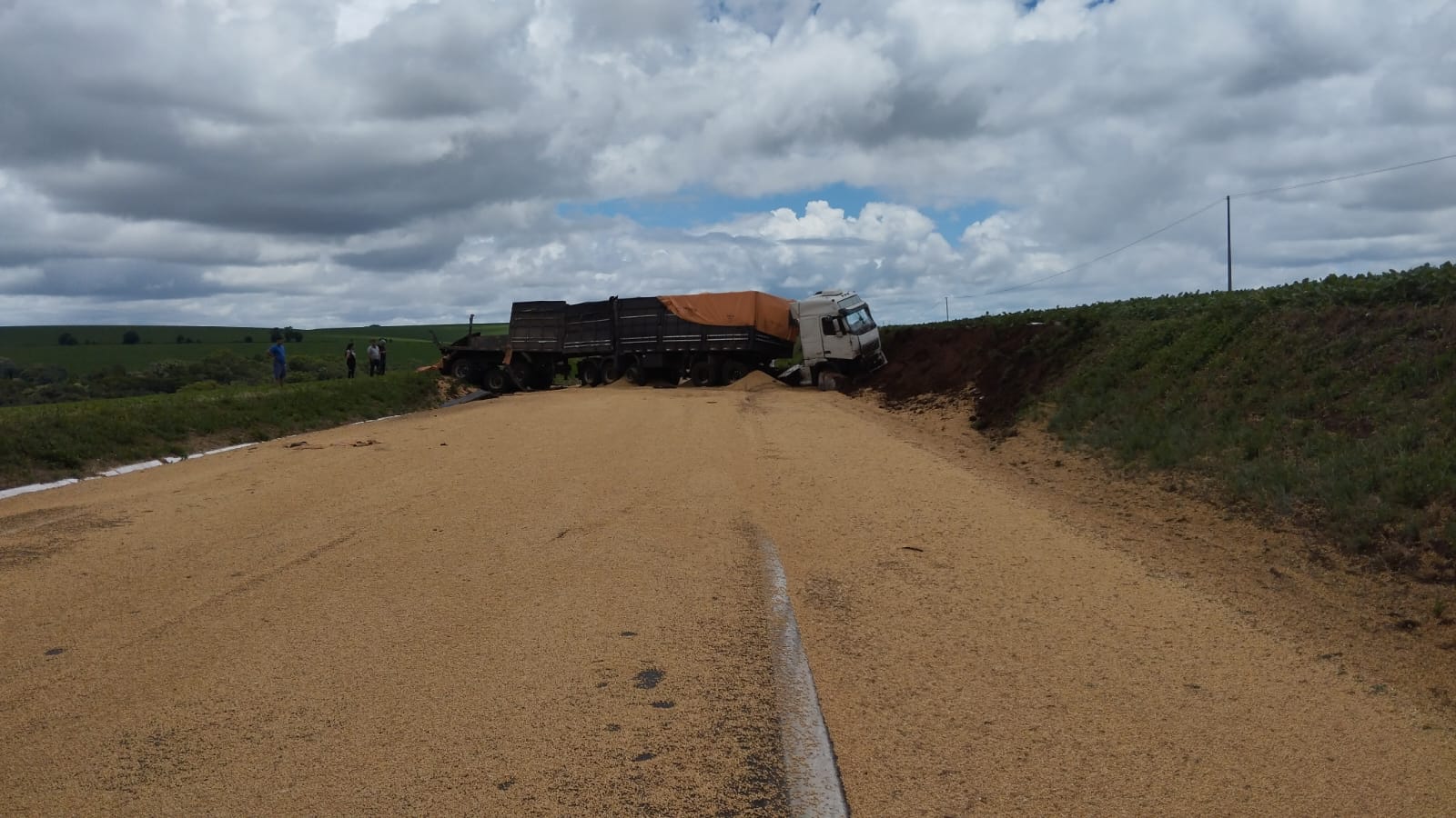 A ocorrência, cujos detalhes ainda estão sendo apurados, envolve um caminhão carregado com soja. O produto está esparramado na pista, impedindo o fluxo normal do trânsito na rodovia.