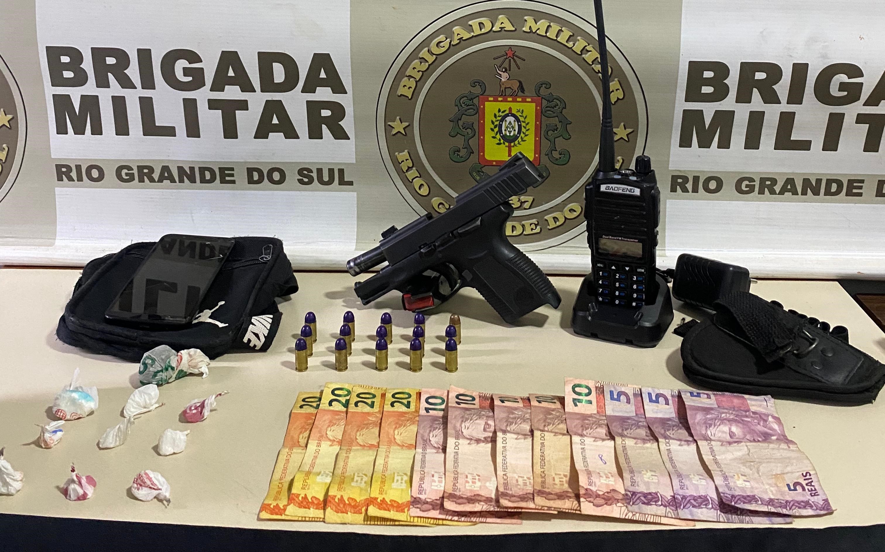 O indivíduo que permaneceu foi abordado, e com ele foram localizadas uma pistola calibre 380, quinze munições intactas de mesmo calibre, um rádio comunicador, nove porções de cocaína, uma porção de maconha, um coldre, além de uma mochila na cor preta e uma quantia em dinheiro.