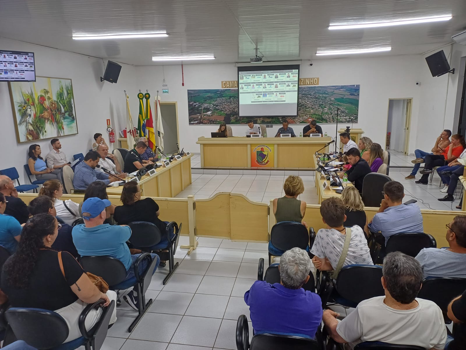A primeira sessão ordinária da Câmara de Vereadores de Carazinho em 2025, na noite desta segunda-feira (6), contou a presença de bom público. Boa parte era de familiares e apoiadores do vereadores, especialmente dos novos que compõem a 19ª Legislatura. Das 13 cadeiras, oito são ocupadas por "caras novas" em relação aos 4 anos anteriores, embora algumas que já passaram pela casa em outras ocasiões: Berenice Müller, Juliani Pinzon Pontes (PSDB), Erlei Vieira, Cleomar Silva, Everton Hunning (PP), Cesar Salles, Vinicius Kunrath (PSB) e Alaor Thomaz (PDT).