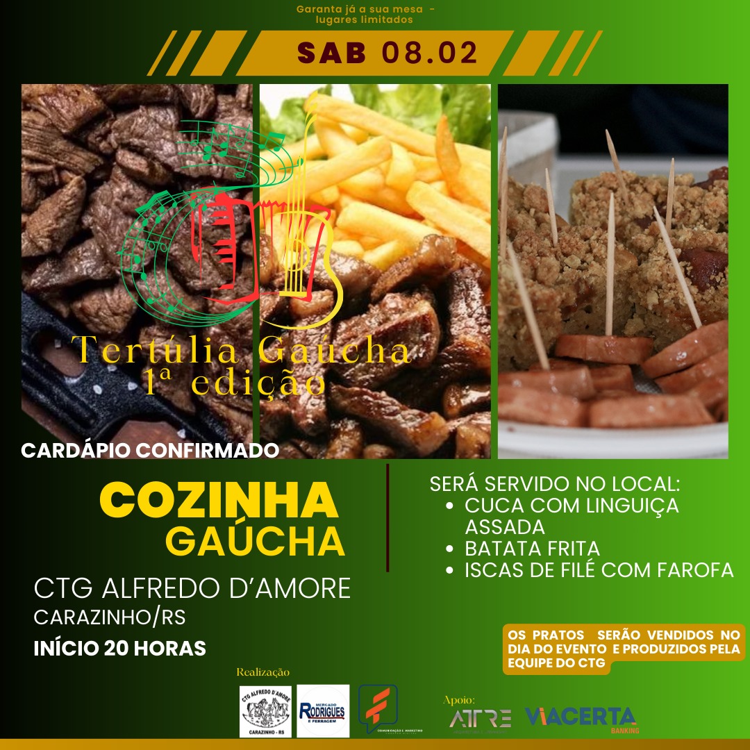 Garanta seu lugar e celebre o orgulho de ser gaúcho! Os ingressos podem ser adquiridos pelo WhatsApp (54) 98122-7824 com Tiago ou (54) 9 8132-5338 com Fernando.