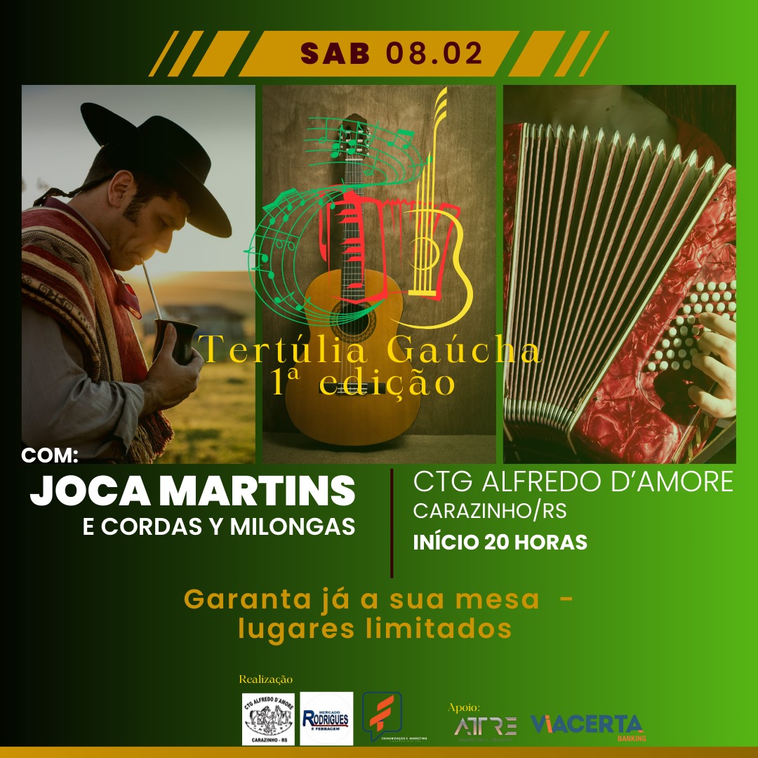 A paixão pela cultura gaúcha encontra seu palco na 1ª Edição da Tertúlia Gaúcha, que promete uma noite memorável em Carazinho/RS. O evento acontecerá no dia 08 de fevereiro, sábado, a partir das 20h, no tradicional CTG Alfredo D’Amore, trazendo uma programação rica em música, arte e tradição.