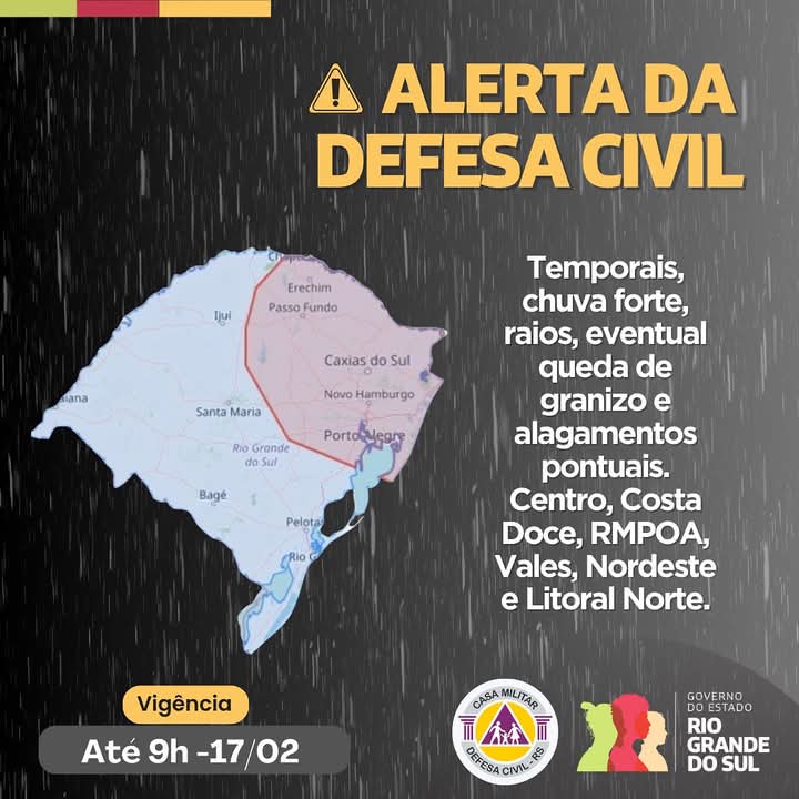 Defesa Civil do RS alerta para temporais até o início desta segunda-feira (17)