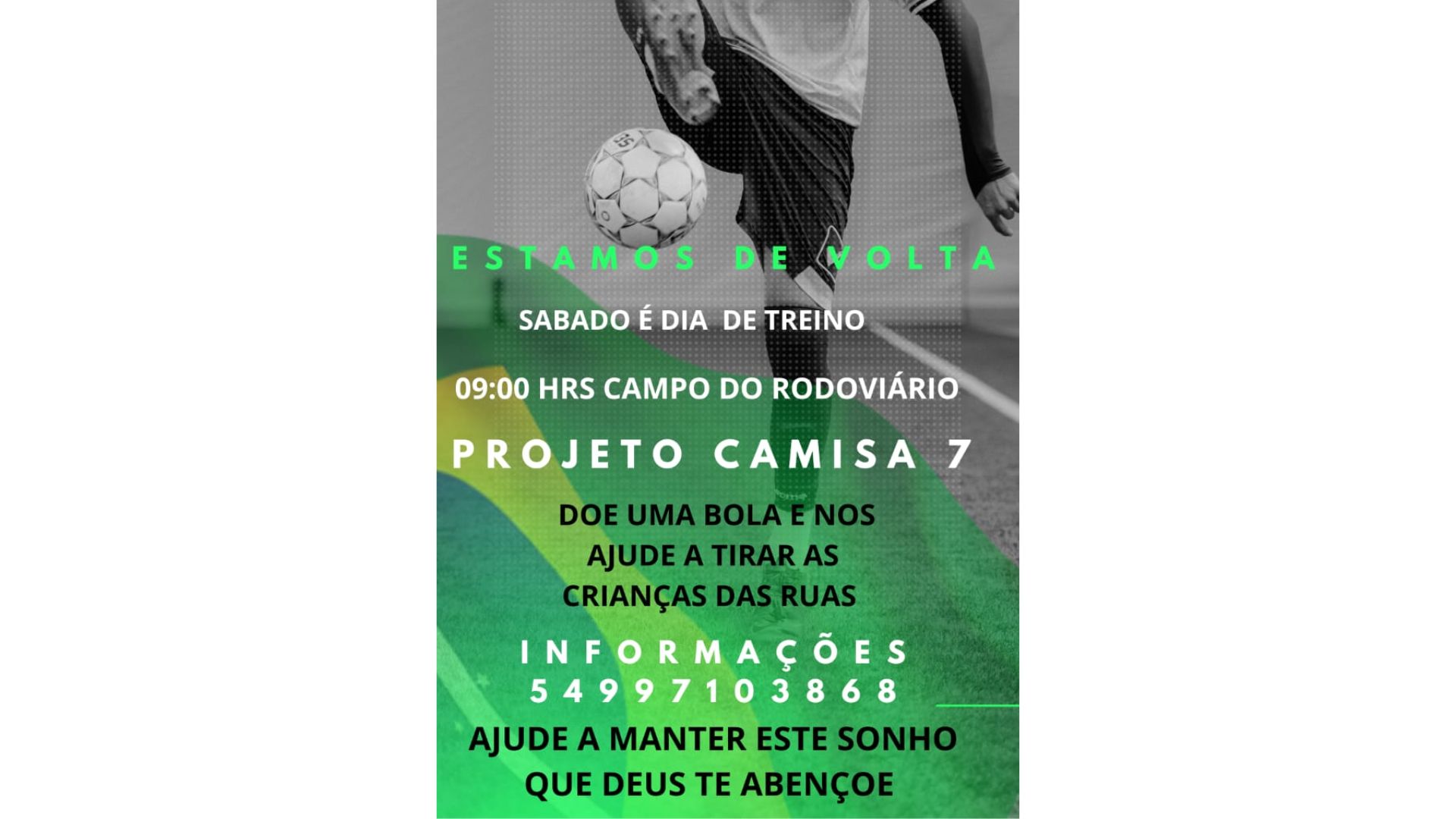 O Esporte Clube Rodoviário, do bairro Medianeira, em Carazinho, retoma neste sábado (29), a partir o projeto social Camisa 7. Antes das atividades será oferecido um café da manhã para as crianças. A direção do clube está angariando doações de alimentos para ofertar este café às crianças atendidas no projeto. Quem deseja contribuir pode acionar o desportista Boby Pires, pelo telefone 54 9 9710-3868.