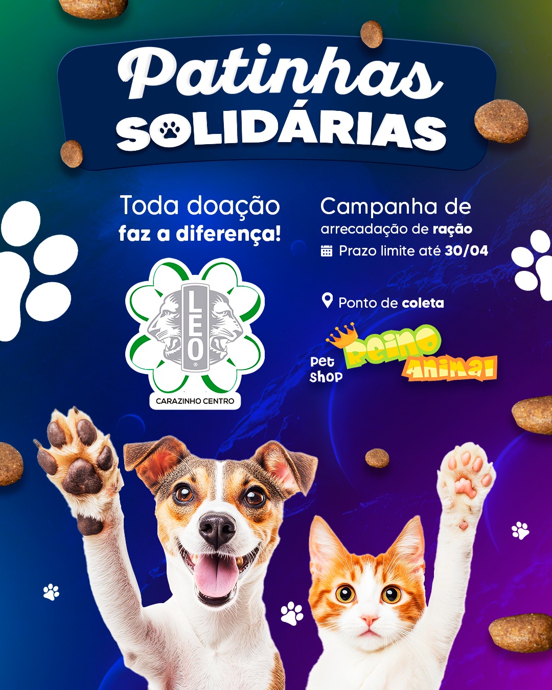 O LEO Clube Carazinho Centro está promovendo a Campanha Patinhas Solidárias. A iniciativa busca auxiliar na arrecadação de ração para animais, principalmente cães e gatos, que serão entregues para entidades que atuam na causa animal, especialmente, aquelas pessoas que auxiliam de forma independente e voluntária no cuidado e no resgate de pets.