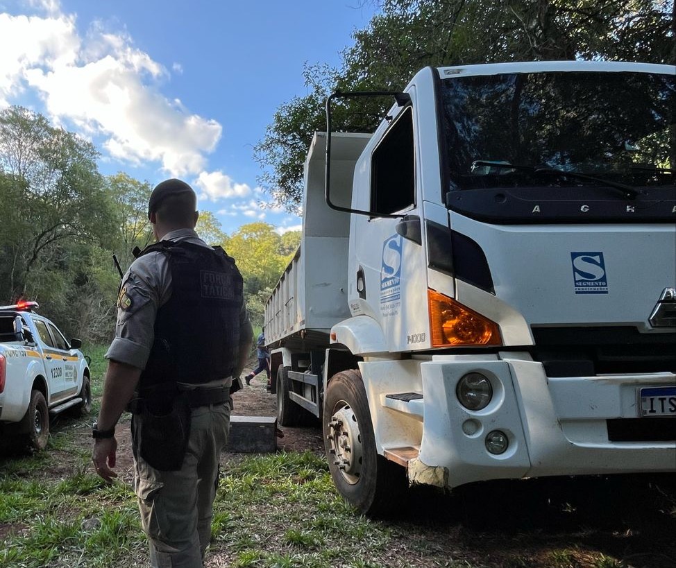 A ação ocorreu durante a Operação Cerco Fechado, quando equipes da Força Tática realizaram diligências e localizaram o caminhão, que foi encontrado abandonado em uma lavoura, próximo a uma área de mata.