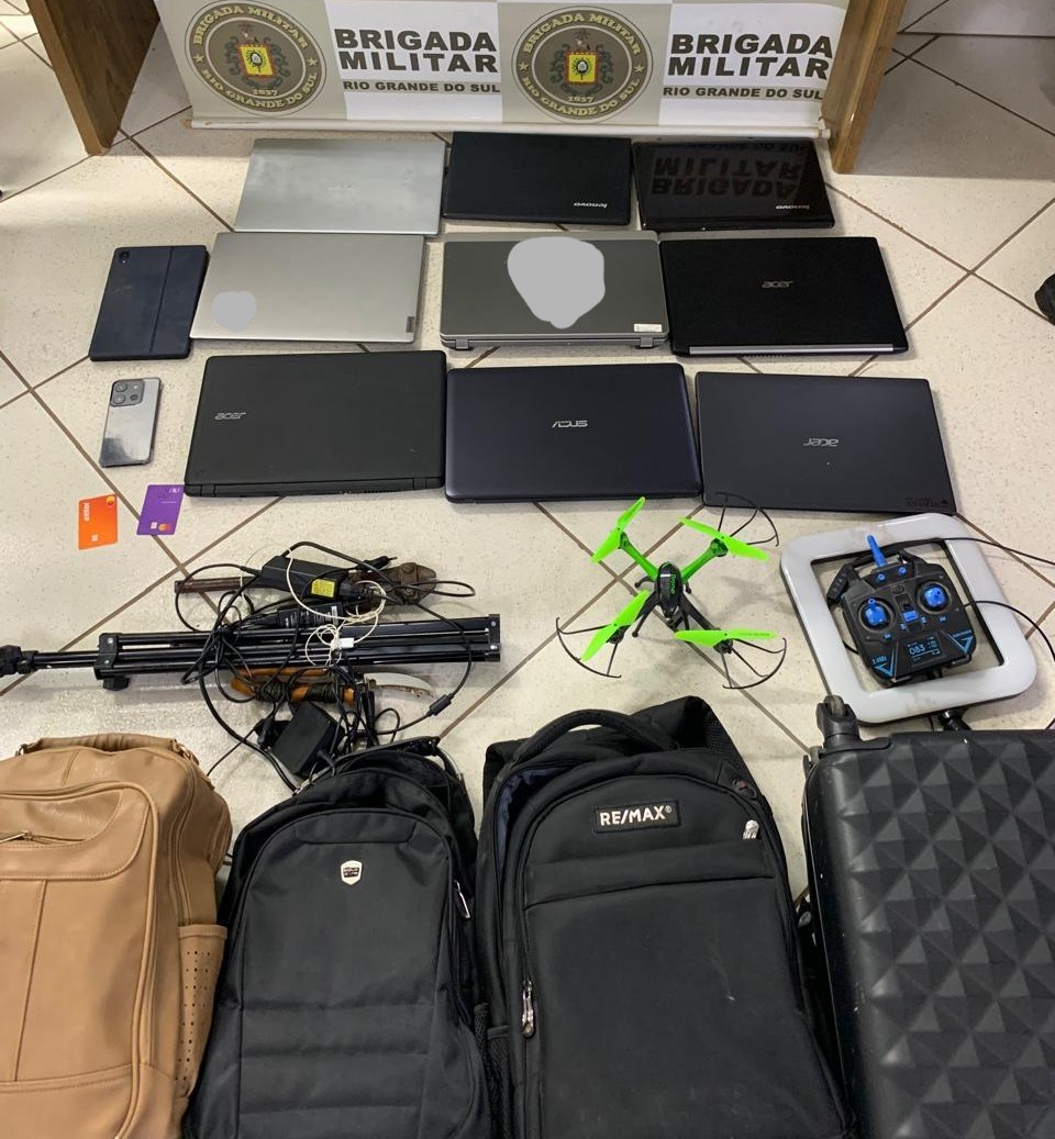 No total, foram apreendidos sete notebooks, um tablet, um drone com controle, uma TV 40', um celular, uma mala e três mochilas, um tripé de gravação.