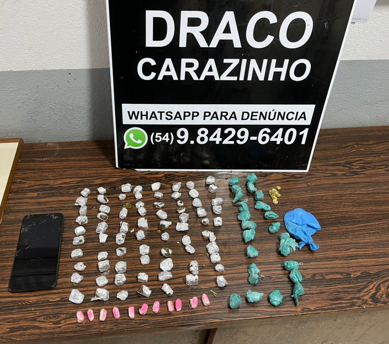 Durante a revista, o adolescente foi identificado e foram encontradas em seu poder aproximadamente 100 porções de maconha e 11 comprimidos de ecstasy. Em razão disso, o adolescente foi conduzido ao Hospital de Caridade de Carazinho (HCC) para os procedimentos de praxe e, em seguida, apresentado na Delegacia de Polícia de Pronto Atendimento (DPPA) para o registro da ocorrência e adoção das medidas legais cabíveis.