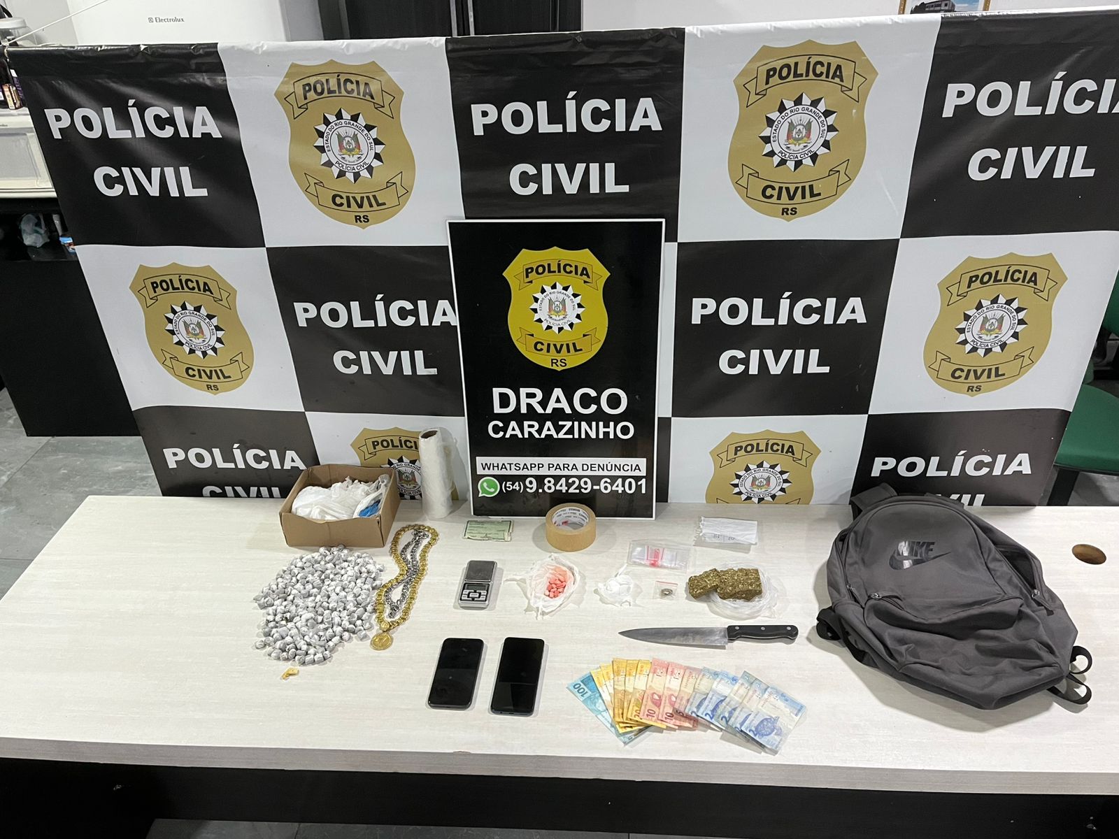 Diante das evidências, foi dada voz de prisão em flagrante ao indivíduo, que possui antecedentes relacionados ao tráfico e já havia sido preso anteriormente pela DRACO transportando entorpecentes. O preso foi encaminhado ao Hospital de Clínicas de Carazinho (HCC) para exame de corpo de delito e, posteriormente, apresentado na Delegacia de Polícia de Pronto Atendimento (DPPA) para a lavratura do Auto de Prisão em Flagrante.