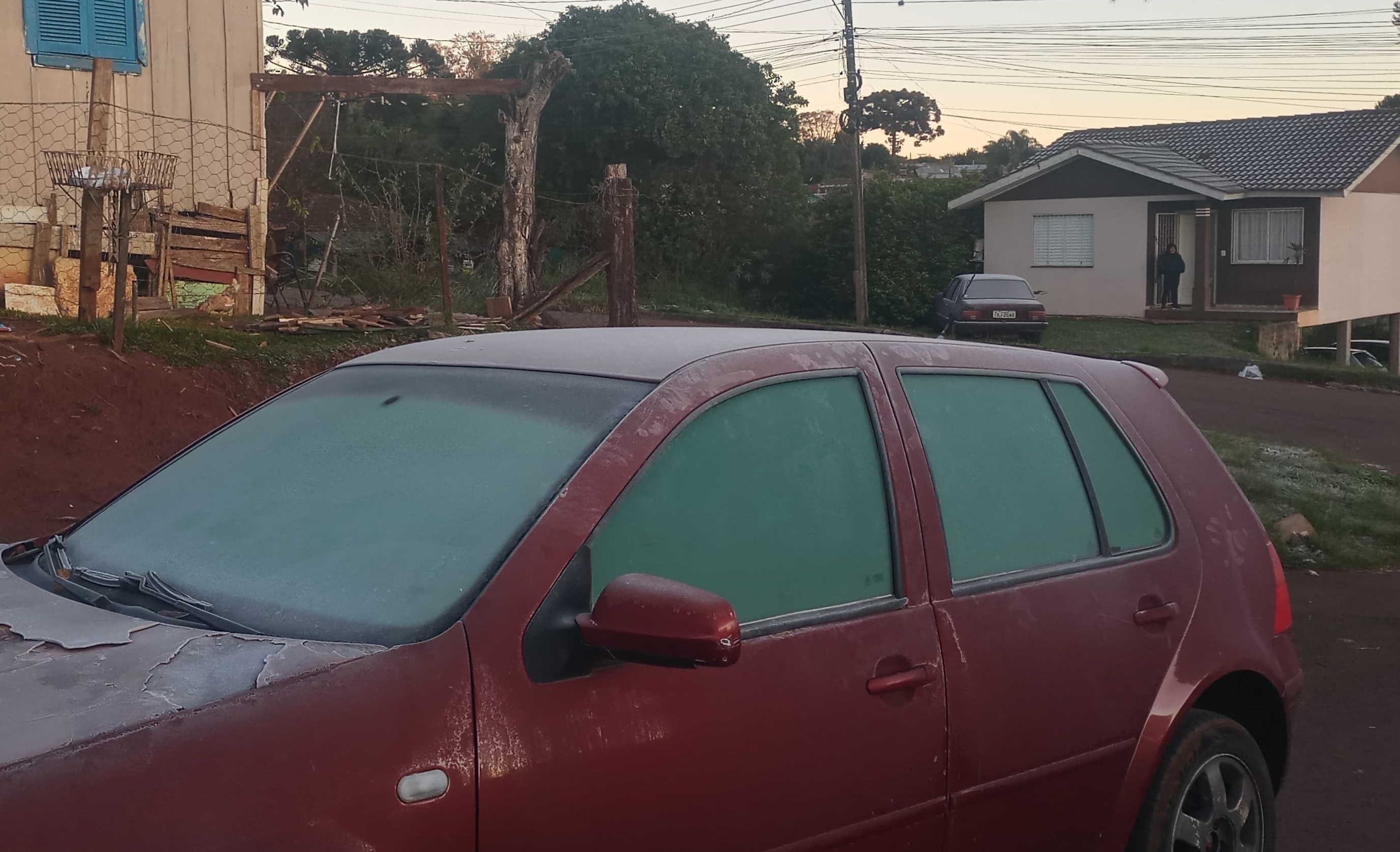 Para quem aprecia o frio, a paisagem do início da manhã desta quarta-feira (25) agradou bastante. Várias pontos da cidade registraram geada, deixando campos, telhados e até veículos brancos de gelo. Contrastanto com o sol, o fenômeno da natureza até lembrou o brilho de pedras preciosas.