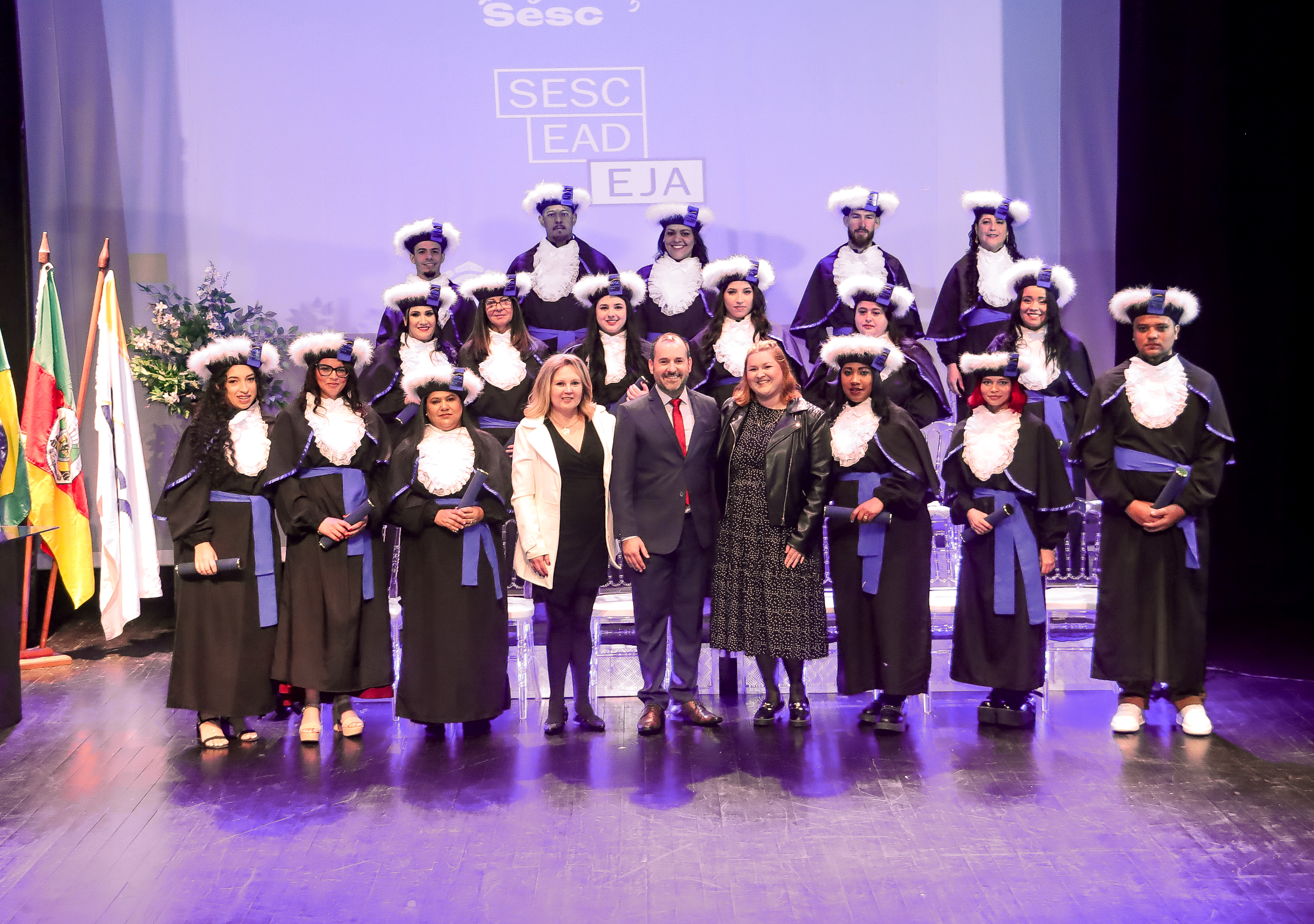 O Sesc Carazinho realizou no último sábado (16), a formatura de 17 alunos da Educação a Distância de Jovens e Adultos (EAD EJA) da Unidade. A cerimônia marcou a conclusão de um programa educacional que integrou o currículo do Ensino Médio a uma formação especializada em Produção Cultural, ampliando horizontes de aprendizagem e a inserção no mercado de trabalho.