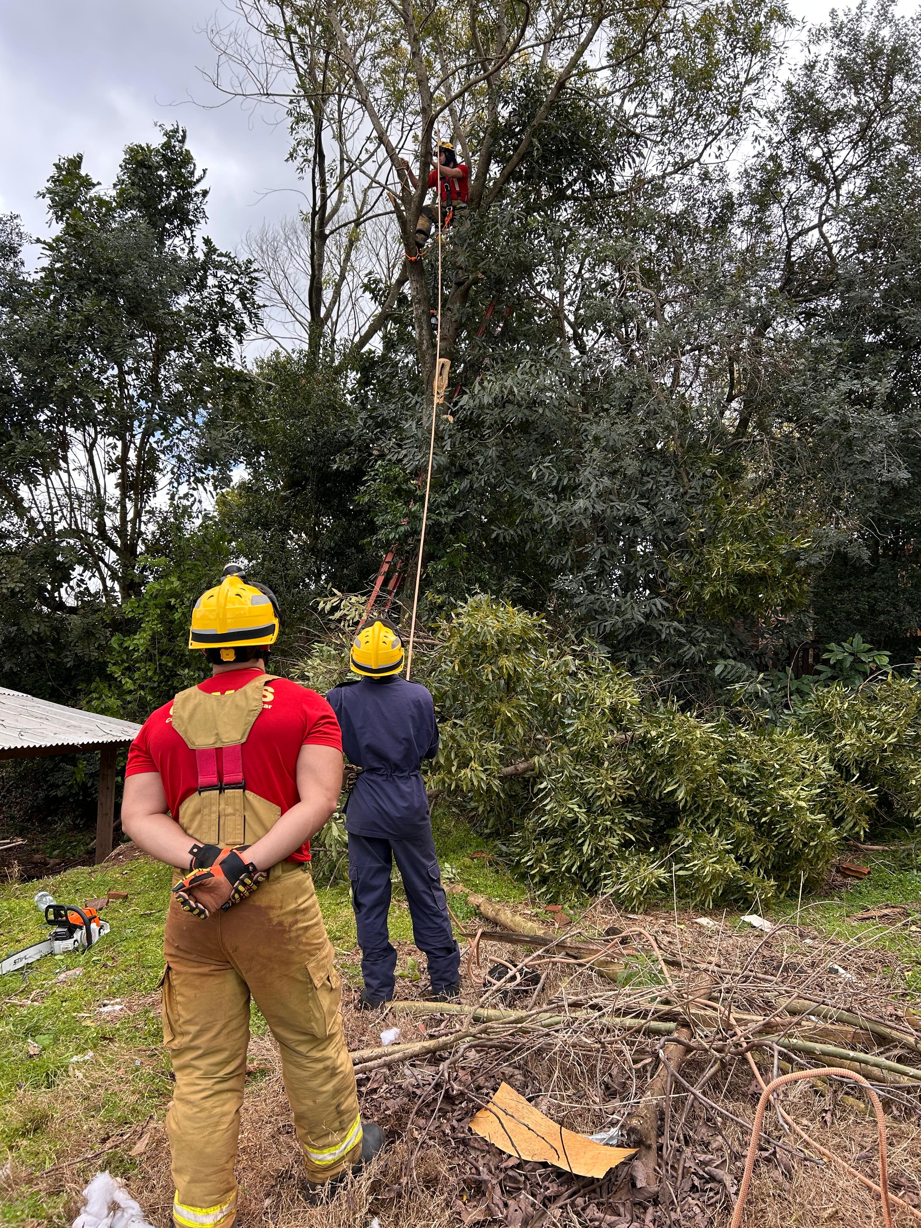 A principal ação do Corpo de Bombeiros foi a avaliação de risco, que identificou parte da árvore ainda em pé, com perigo iminente de nova queda sobre a estrutura já danificada. Para mitigar o risco e evitar danos secundários, a equipe realizou um corte técnico e direcionado. Foi necessário o corte de outras três árvores menores para garantir que a parte instável da árvore principal caísse em uma área segura.