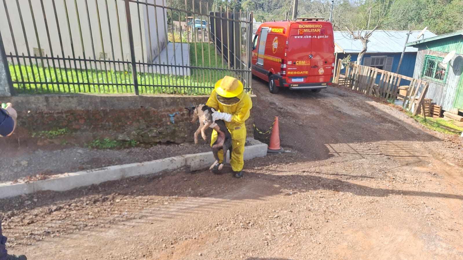 Durante o atendimento da ocorrência de corte de árvore, as equipes foram acionadas para uma segunda chamada: o resgate de um cão de grande porte que estava sendo atacado por um enxame de abelhas. O animal estava acorrentado, o que o impedia de fugir.