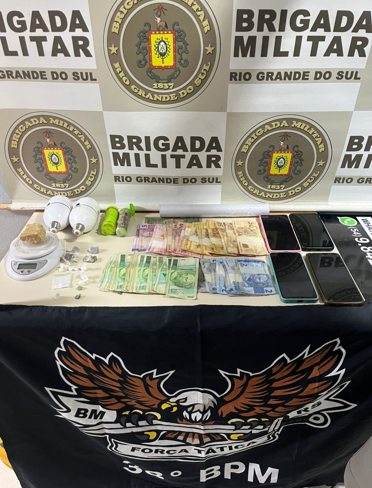 Na sequência, os policiais foram até o endereço indicado e, ao ingressarem no pátio, ouviram alguém gritar “joga no vaso”. Dentro do imóvel, os agentes flagraram um indivíduo tentando se desfazer de entorpecentes no banheiro. Durante as buscas, foram apreendidos 54 gramas de crack, 5 gramas de maconha, 6 porções de cocaína, quatro celulares, R$ 390,00 em dinheiro, uma balança de precisão e um rolo de plástico filme.