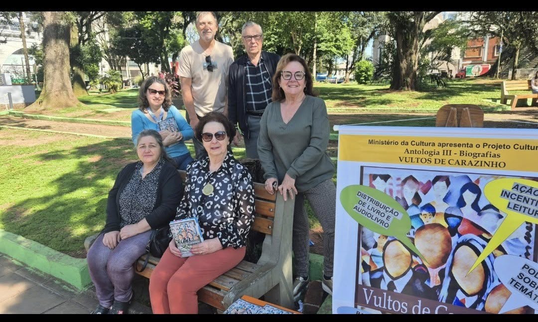 A Academia Carazinhense de Letras - ACL deu continuidade, na manhã deste sábado (4), ao projeto cultural "Vultos de Carazinho", viabilizado com recursos da Política Nacional Aldir Blanc. Alguns escritores que participaram da obra abordaram leitores que passam pelo local e entregaram gratuitamente exemplares do livro.