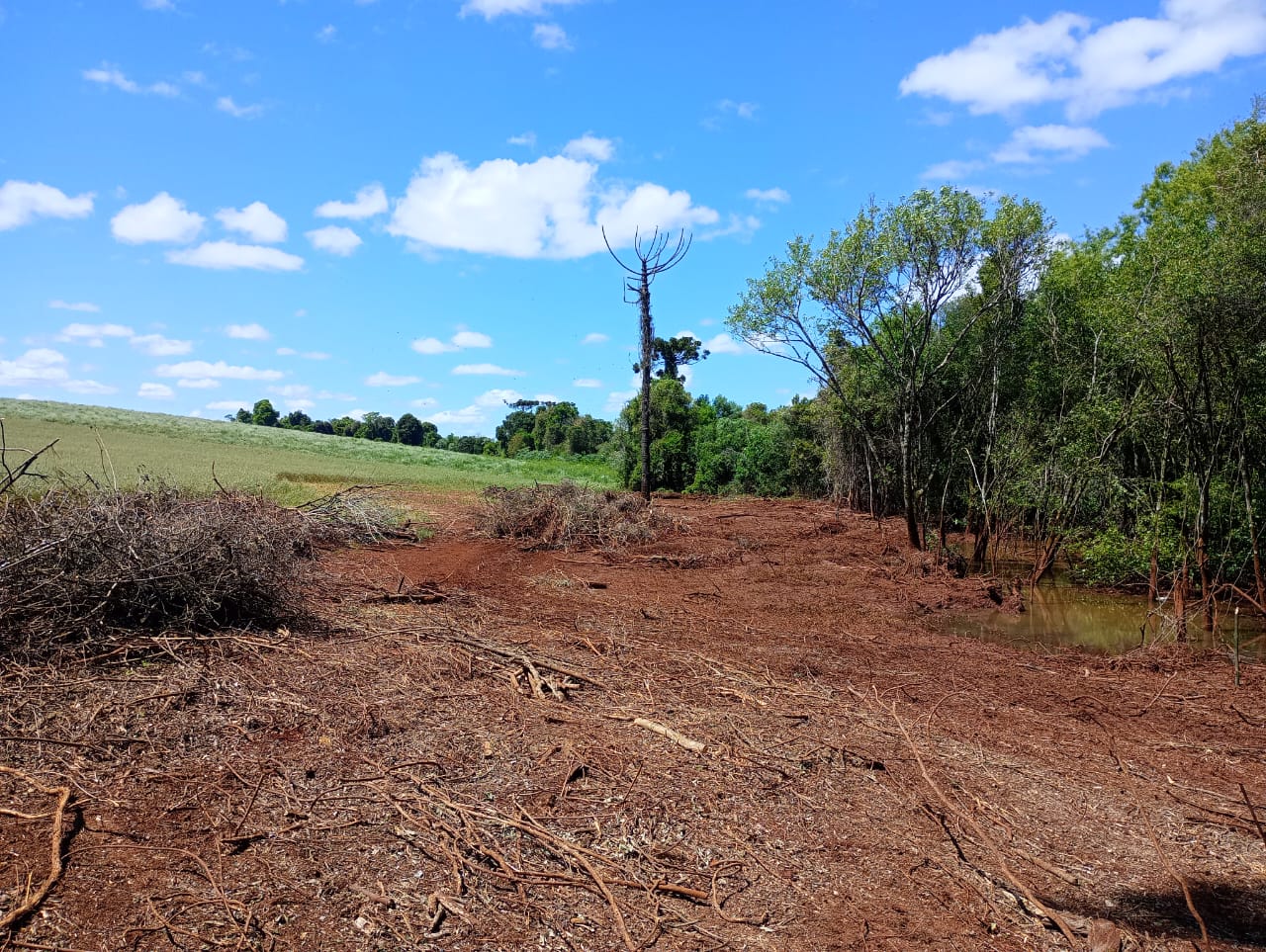 Durante a vistoria, foi identificada, em ponto mais afastado, uma árvore fracionada em três toras, da espécie pinheiro-brasileiro (Araucaria angustifolia), que consta na lista oficial de espécies ameaçadas de extinção.