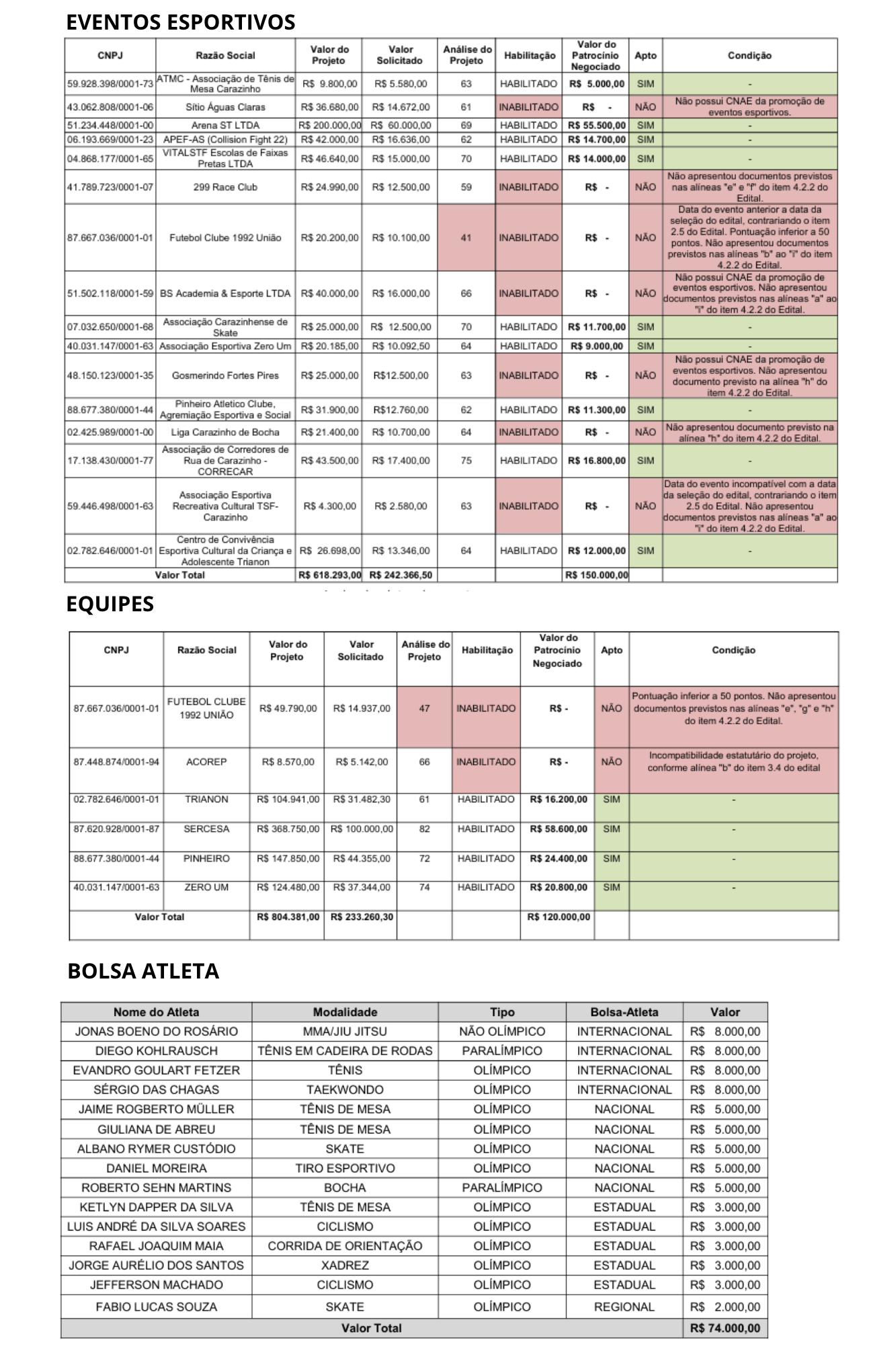 Nos eventos esportivos e para as equipes, o edital previa o patrocínio de uma parcela do valor do projeto. No caso dos eventos serão R$ 150 mil e para as equipes, R$ 120 mil. Confira abaixo: