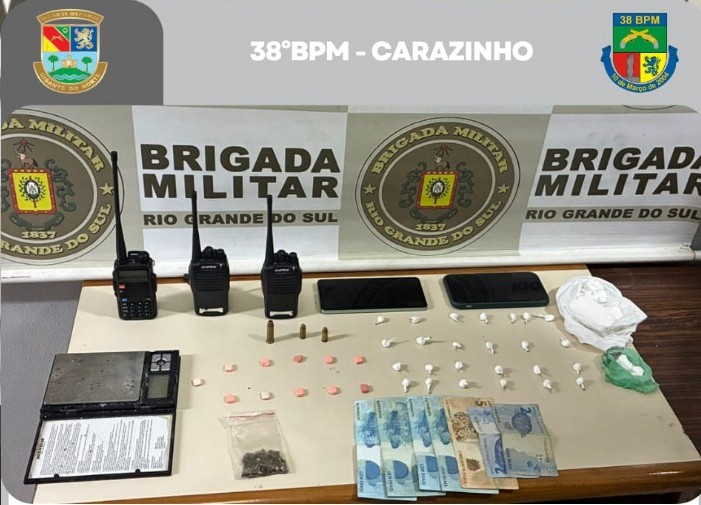 Na madrugada desta quinta-feira, 16, Brigada Militar prendeu um homem e uma mulher, ambos de 25 anos, por tráfico de drogas e resistência. Durante uma abordagem no Bairro Glória, em Carazinho, e após revista pessoal no homem, os policiais localizaram 25 invólucros de substância semelhante à cocaína, já fracionada e embalada para comercialização, além de R$ 454,00 em dinheiro, um iPhone 11, um celular Motorola e outros objetos.