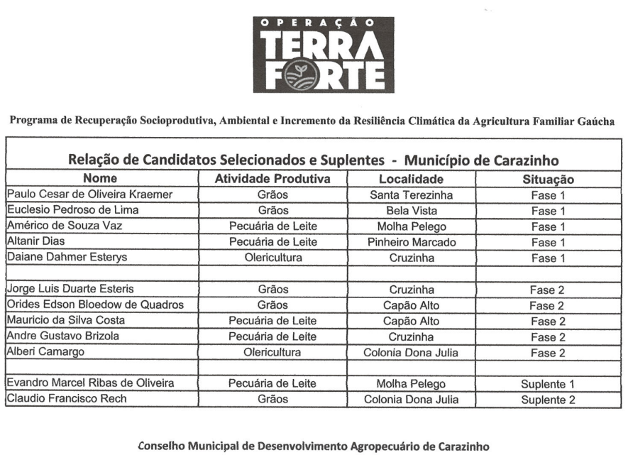 Definidos os contemplados de Carazinho no Programa Terra Forte