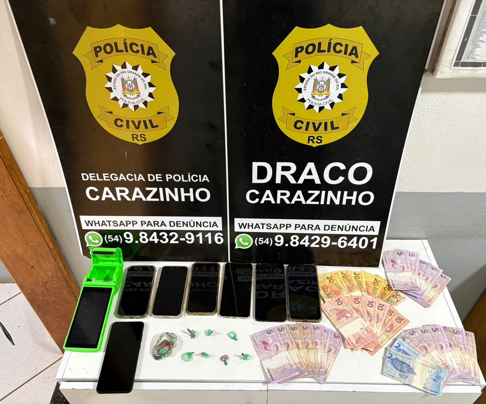 Durante as buscas, os agentes localizaram buchas de substância análoga à cocaína escondidas junto ao caixa do estabelecimento, estratégia utilizada para tentar dificultar a localização dos entorpecentes. Outros objetos relacionados à prática do tráfico também foram apreendidos no interior da conveniência.