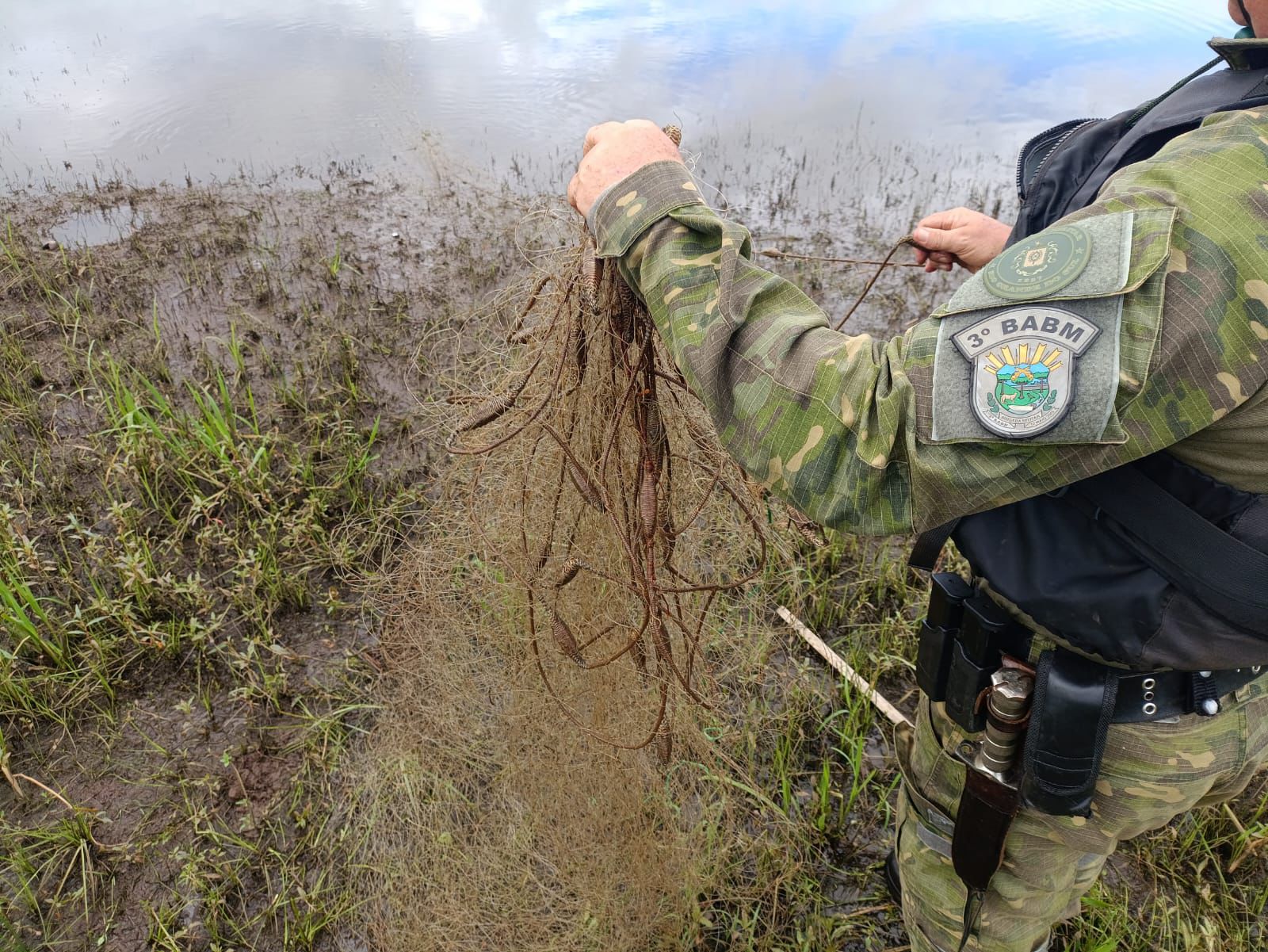 Já no domingo (18), houve patrulhamento aquático na Barragem do Rio Jacuí, no município de Tio Hugo. Durante a ação, um barco foi avistado às margens do lago, fixados na embarcação estavam 150 metros de redes de pesca. Em terra, os policiais militares localizaram um balde plástico com peixes já mortos. Os responsáveis pelos materiais não foram localizados.