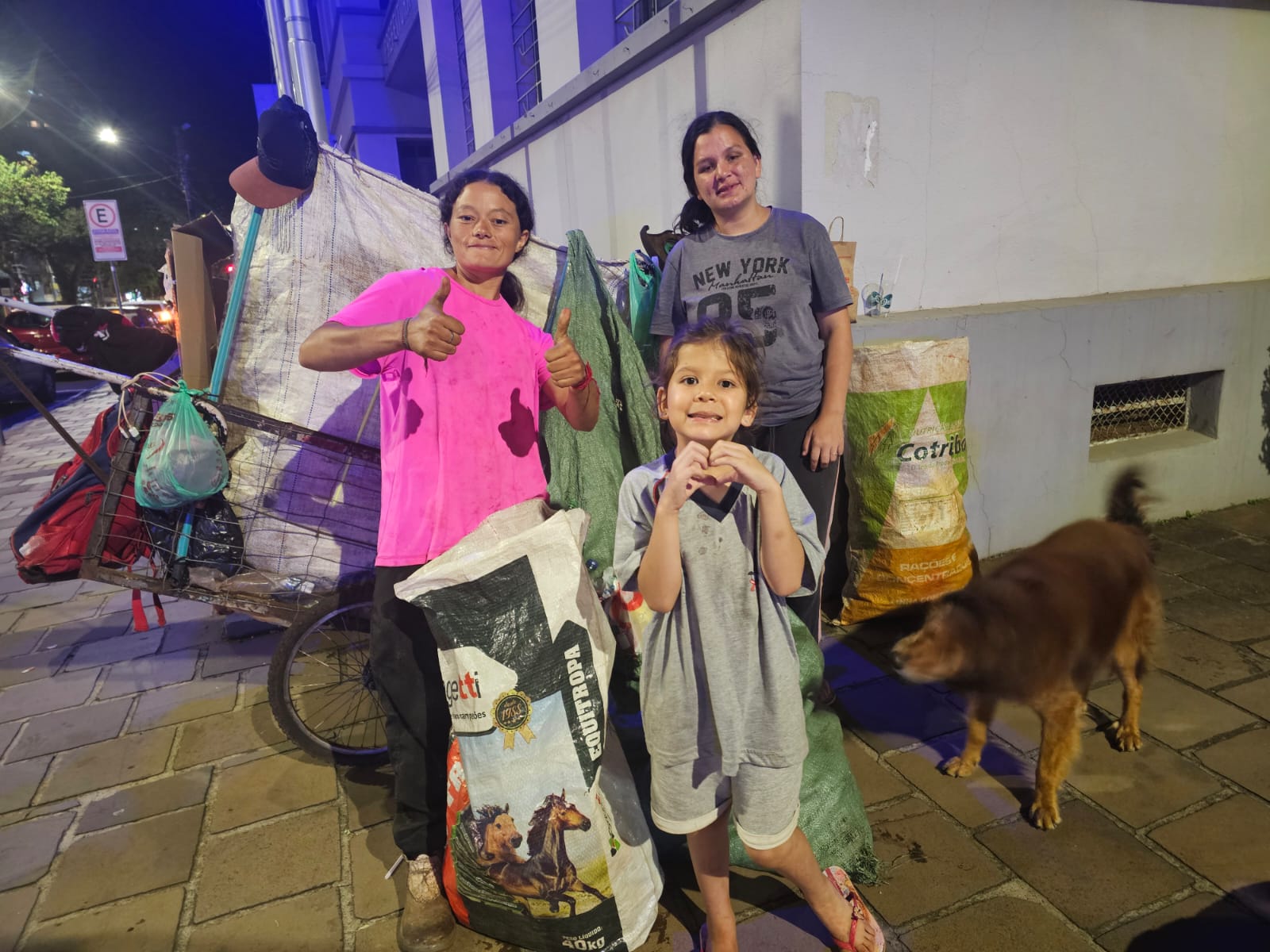 Elas contaram para a reportagem de O Correspondente sobre a rotina de trabalhar nas ruas, dia e noite, numa atividade que é essencial para o meio ambiente. Carazinhense, Vanuza conheceu essa função cedo. Filha de recicladores, já aos 5 anos estava com os pais e irmãos coletando material nas ruas. “É um trabalho honesto, digno, a gente se acostumou. A gente gosta desse trabalho”, disse ela, afirmando que não quer mudar de trabalho. “Dá pra viver, e a gente ganha muita coisa das pessoas, roupa, calçado, comida, um dia até (ganhamos) roupinha pros cachorrinhos. Nem eles ficam de fora!”, colocou, apontando para os quatro cães que as acompanham cidade afora e descansavam na calçada da esquina da prefeitura: Ursa, Tip, Bethoven e Pretinha.