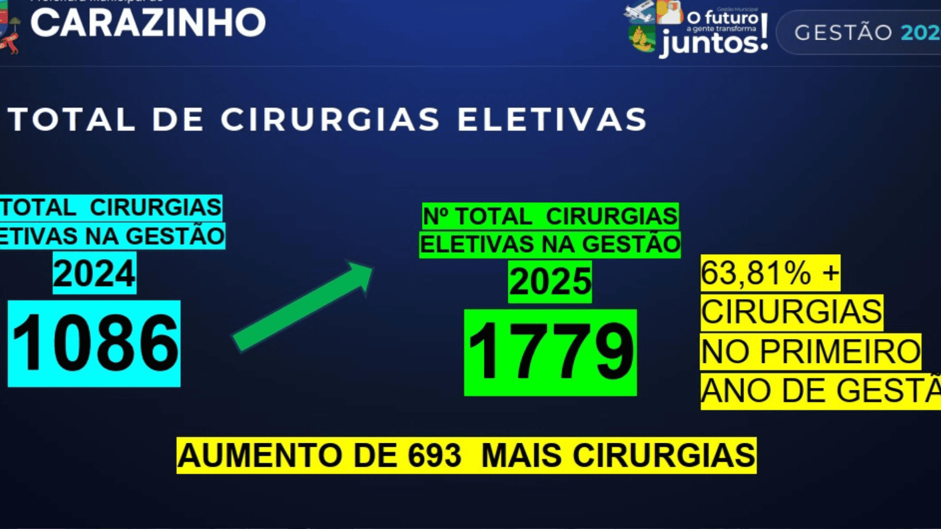 Já no primeiro ano da atual gestão municipal os resultados apontam um salto no número de cirurgias eletivas realizadas em Carazinho. De 1.086 no ano de 2024, passando para 1.779 em 2025, o que representa um índice de 63,81% a mais.