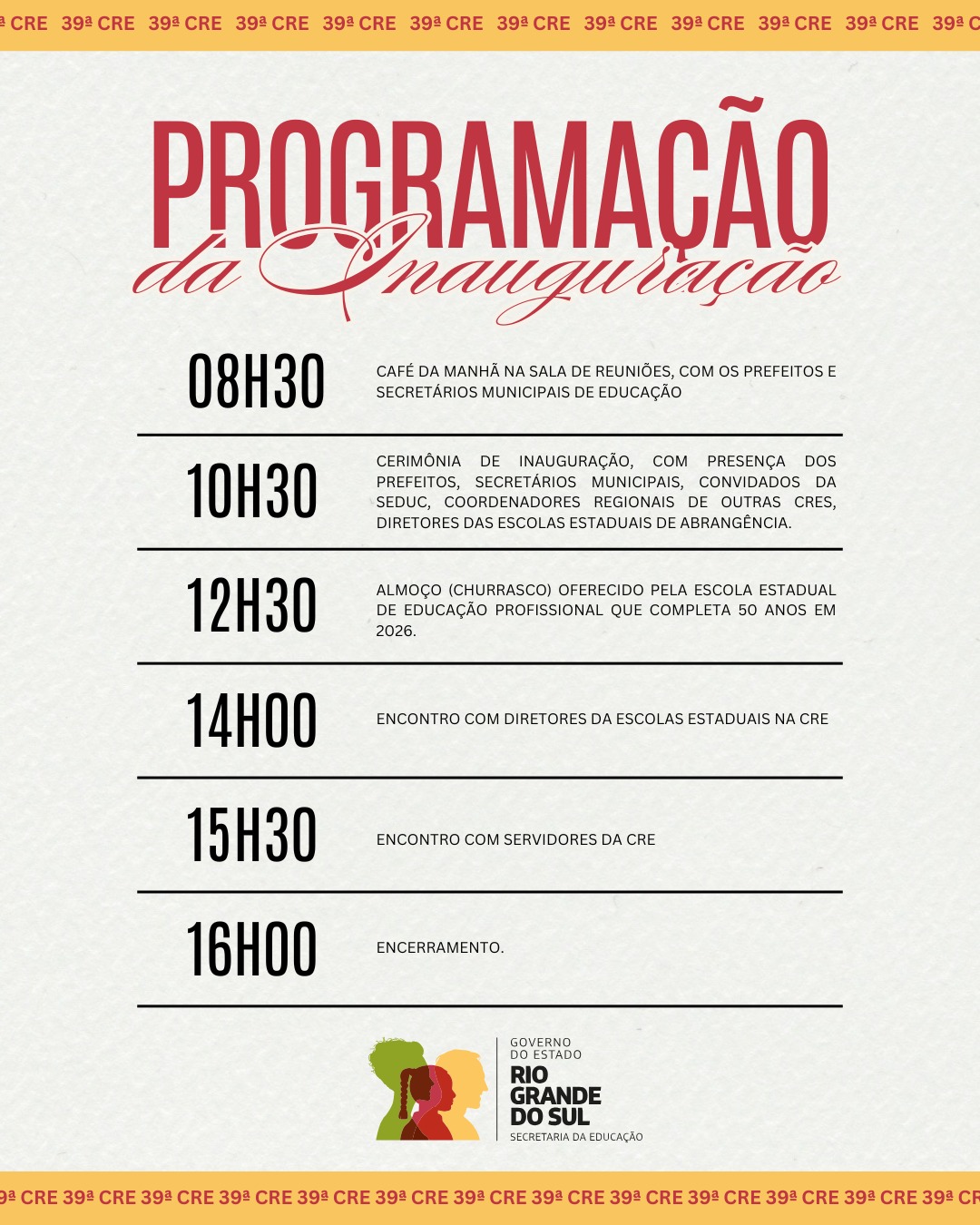 Com a presença de representantes da Secretaria Estadual de Educação - Seduc, de escolas da área de abrangência, prefeitos e outras autoridades, a 39ª Coordenadoria Regional de Educação fará a reinauguração nesta sexta-feira (20), a partir das 10h30min, em Carazinho. Depois de 30 anos funcionando na Avenida Flores da Cunha, bem no centro da cidade, a instituição já atende junto ao prédio do NEEJA, na Rua Epitácio Pessoa, no bairro Broecker.