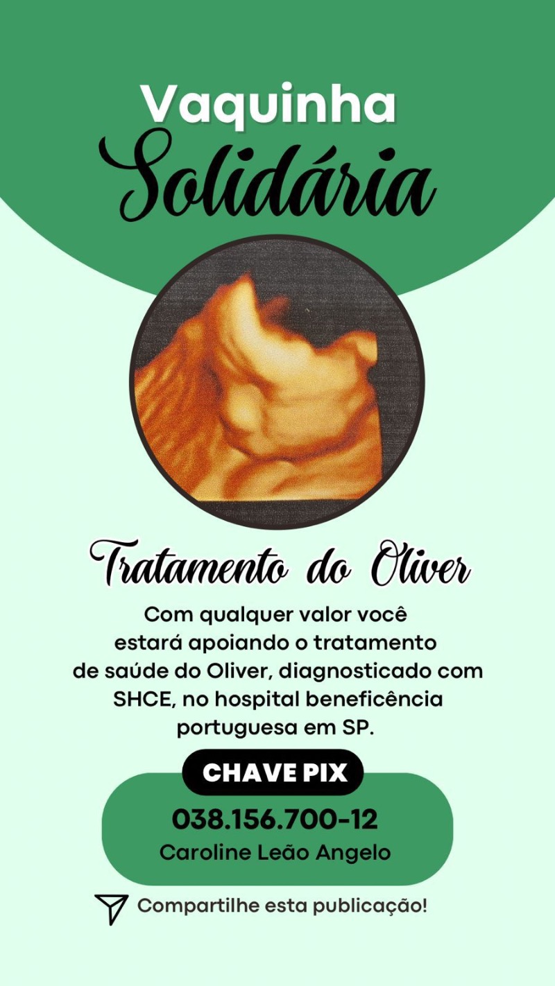 Por isso, Oliver precisa passar por intervenções cirurgias logo após o nascimento. "No Rio Grande do Sul, não temos perspectiva de vida para o caso dele. Então precisamos nos deslocar para São Paulo. Para isso teremos custos altíssimos que infelizmente sozinhos não conseguimos custear. Estamos pedindo ajuda da comunidade para que possamos salvar a vida do nosso filho", diz a mãe.