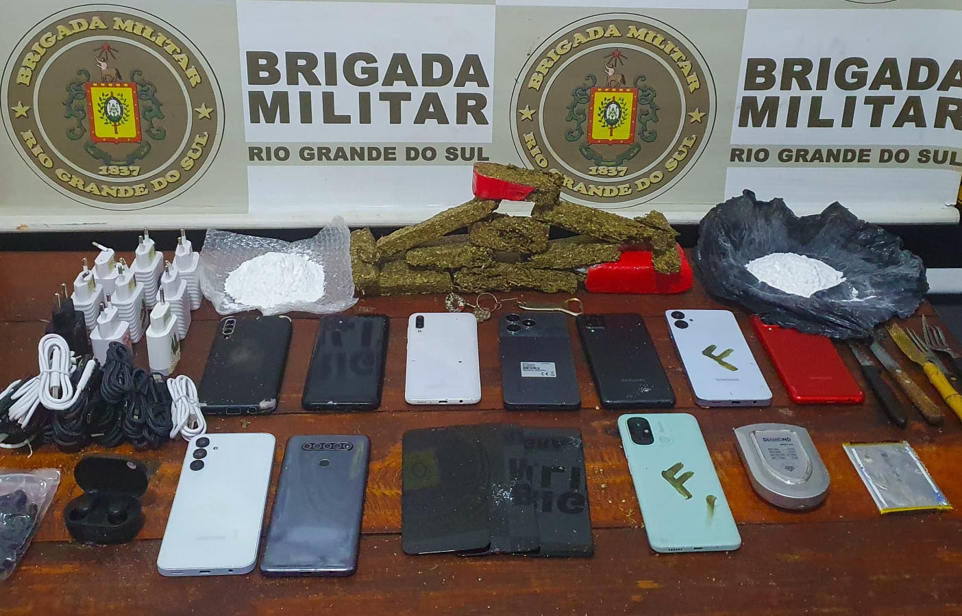 Os materiais que haviam acabado de serem arremessados foram localizados por policial penal dentro do pátio do presídio, sendo apreendidos 11 aparelhos celulares, 3 telas de celulares, 176 gramas de cocaína, 914 gramas de maconha e uma balança de precisão.