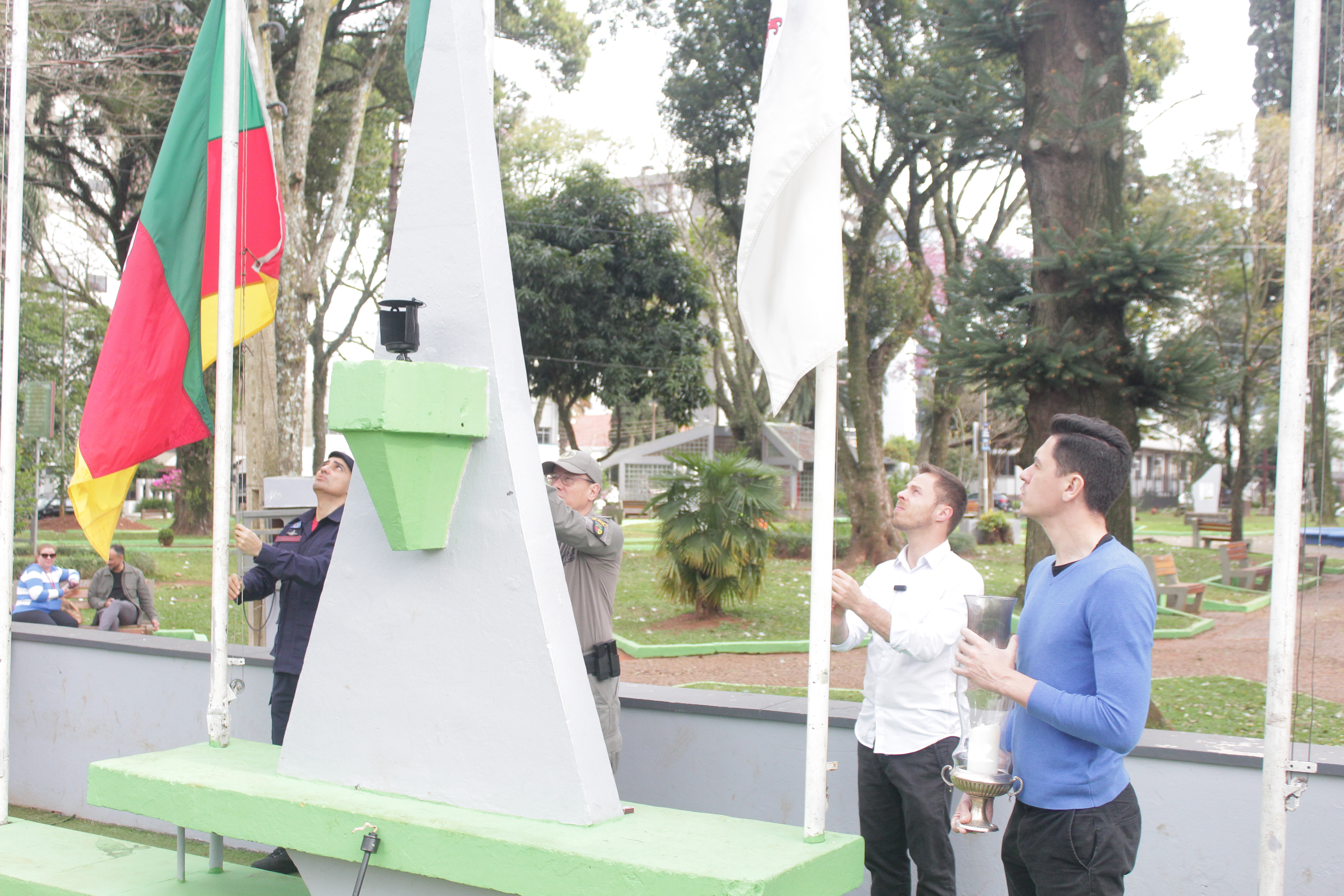 Já no Altar, coube ao chefe do Executivo o acendimento da pira da Pátria. As bandeiras do Brasil, do Rio Grande do Sul e de Carazinho foram hasteadas pelo comandante do 38º Batalhão de Polícia Militar, Major da Brigada Militar, Juliano Moura, pelo comandante do Corpo de Bombeiros Militar, Tenente Osmar de Morais e pelo prefeito, respectivamente. As bandeiras ficaram a meio mastro em sinal de luto pelo falecimento do escritor Luis Fernando Veríssimo, ocorrido no sábado (30).