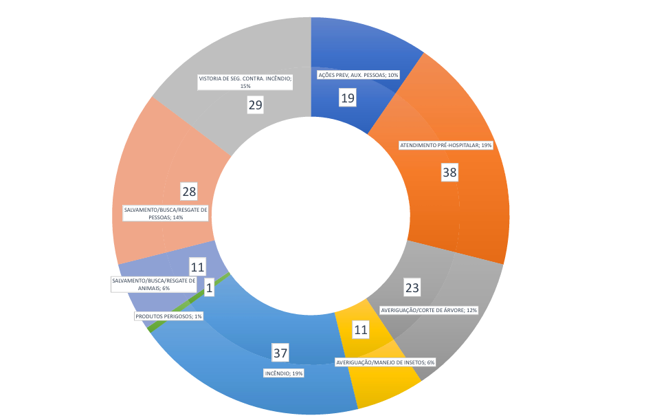 Novamente as ocorrência pré-hospitalares foram a de maior número, somando 38, 19% do total. No levantamento encaminhado à imprensa, os incêndios ocupam a segunda colocação no ranking, com 37 casos (19%). Depois aparecem vistorias de segurança contra incêndio, com 29 atendimentos (15%), salvamento e resgate de pessoas, com 28 casos (14%). O levantamento ainda mostra 23 averiguações e corte de árvores (12%), 19 ações preventicas e de auxílio a pessoas (10%), 11 salvamentos de animais (6%), 11 manejos de insetos (6%), e uma ocorrência envolvendo produtos perigosos.