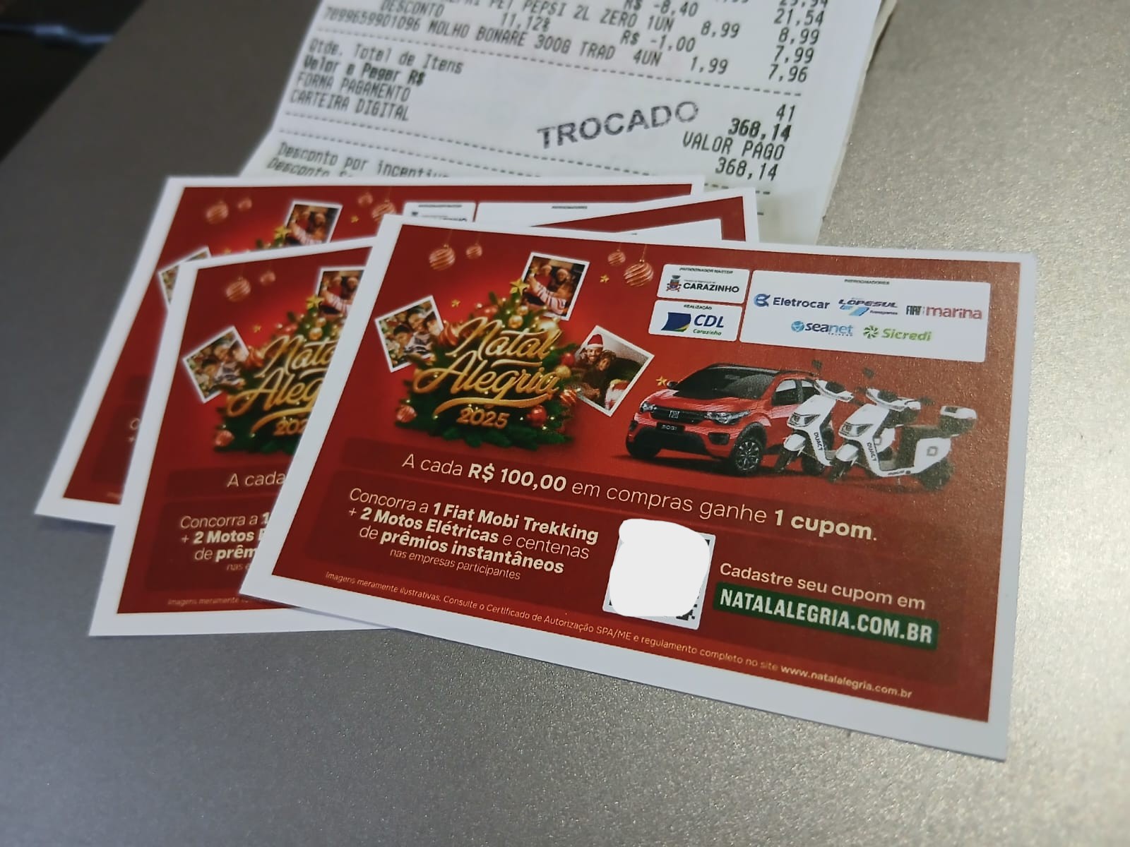 A Campanha Natal Alegria, organizada pela CDL Carazinho, já possui mais de 30 mil cupons cadastrados. Desde o dia 13 de novembro, os estabelecimentos participantes estão distribuindo prêmios instantâneos, através das raspadinhas virtuais que são liberadas assim que o consumidor cadastra um novo cupom e recebe um número da sorte.