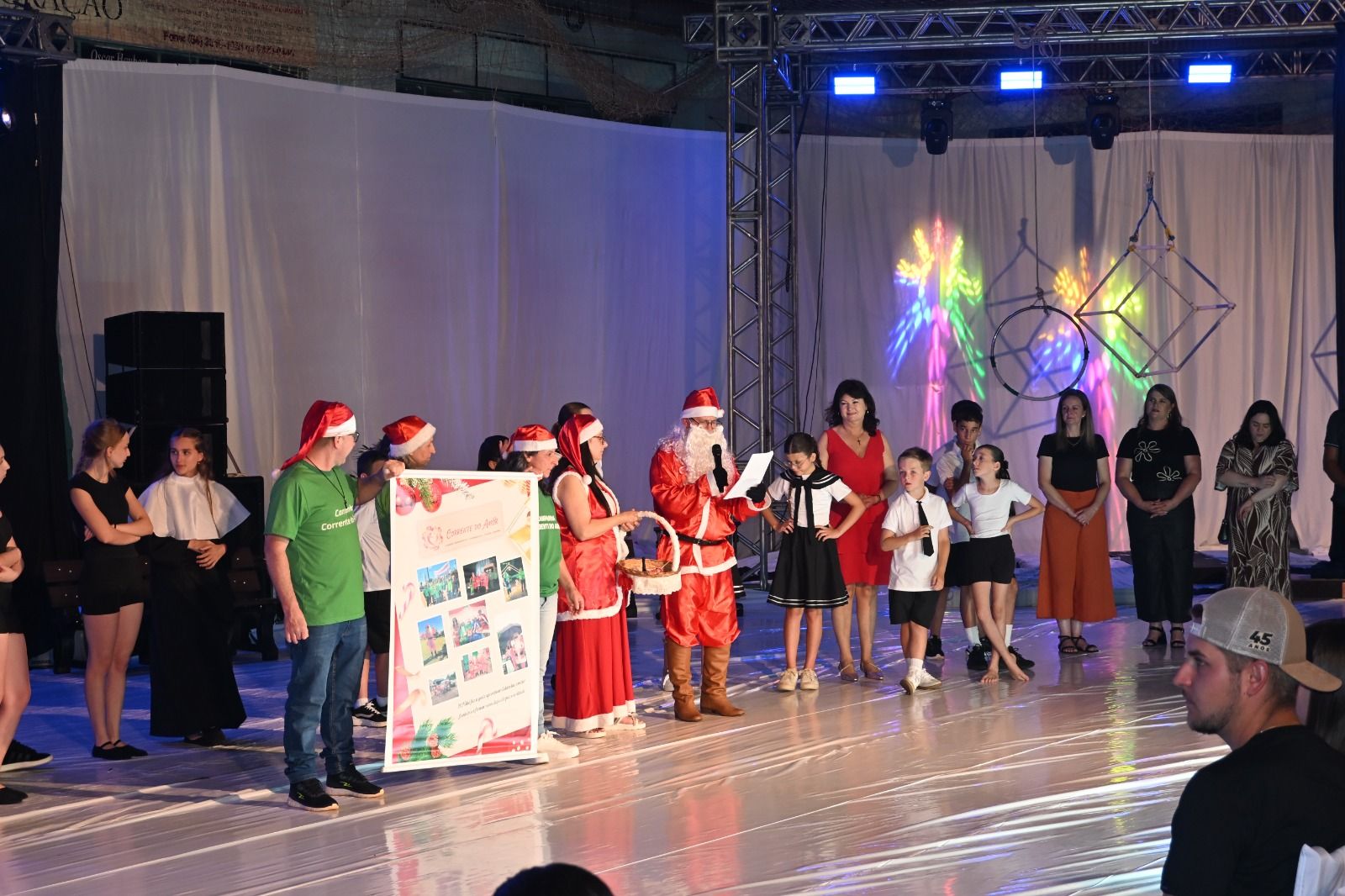 No sábado (13), a programação iniciou no Ginásio São João Batista, com a apresentação do espetáculo “Um Milagre no Natal”, encenado pelo Grupo Artístico do CRAS. A apresentação emocionou o público ao transmitir mensagens de esperança, solidariedade e amor ao próximo. Logo após, a comunidade recebeu a mensagem do Bom Velhinho, momento aguardado especialmente pelas crianças, marcando a chegada oficial do Papai Noel e reforçando a magia do Natal.