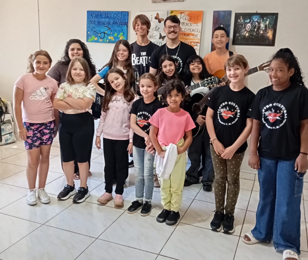 Parte do grupo que frequenta as aulas de violão, do professor Jonatan Moura e de canto, da professora Ianaline dos Santos.