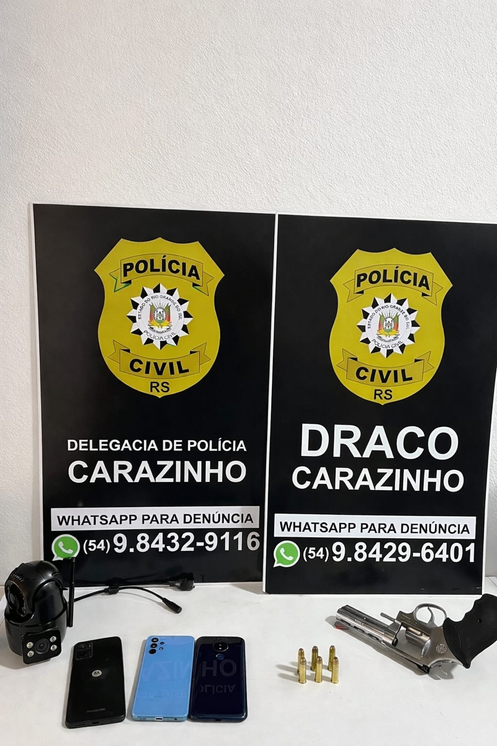 Durante a diligência, os agentes localizaram um revólver calibre .38, municiado, escondido entre roupas no quarto dos fundos do imóvel. Além da arma, foram apreendidos telefones celulares, uma câmera de monitoramento e seis munições. A arma em questão possui registro de furto ocorrido no município de Passo Fundo, ainda no ano de 2023.
