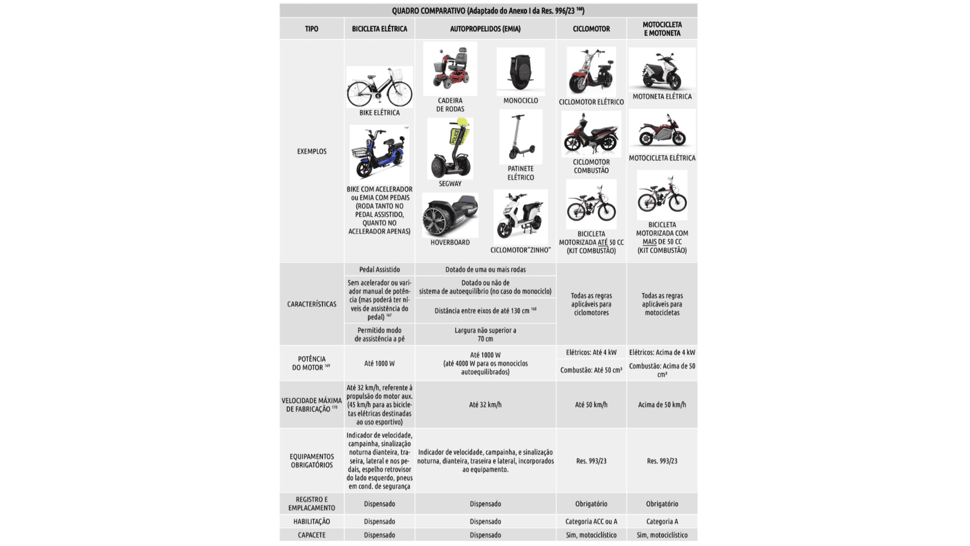 A legislação brasileira sobre o trânsito, em via pública, de ciclomotores, bicicletas elétricas e equipamentos de mobilidade individual autopropelidos, regida pela Resolução CONTRAN nº 996/2023 e novas regras a partir de 2026, exige registro, placa, CNH (A ou ACC) e capacete para ciclomotores (até 4kW/50cc e 50km/h), equiparando-os a motocicletas convencionais; enquanto bicicletas elétricas quando de propulsão humana (motor auxiliar, < 1000W, < 32km/h) não precisam de placa/CNH, mas exigem equipamentos de segurança, sendo proibidas em calçadas.