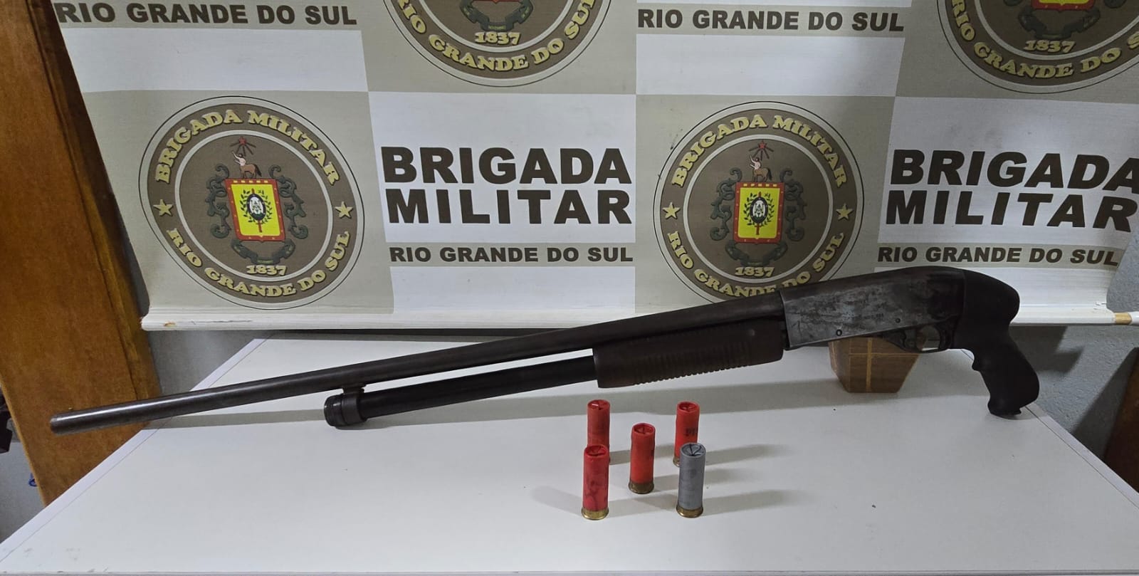 Durante as buscas, foi localizada a arma de fogo: uma espingarda marca CBC, calibre 12, modelo 586, com coronha do tipo Combat, municiada com cinco cartuchos intactos e sem numeração aparente.
