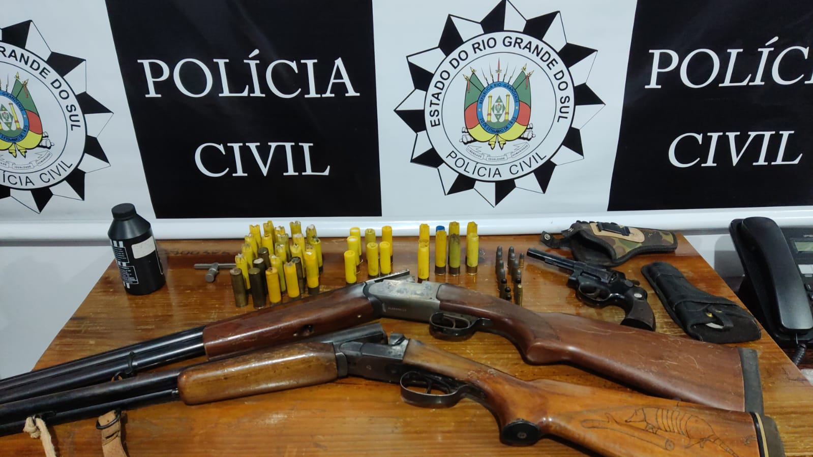Durante as diligências, os policiais civis localizaram e apreenderam três armas de fogo, sendo duas espingardas calibre 20 e um revólver calibre .38, além de diversas munições e apetrechos destinados à recarga de munições.